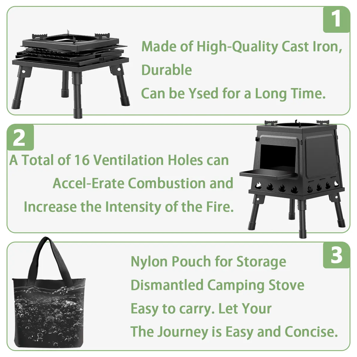 ·This Portable Cast Iron Wood Burning Camp Stove is perfect for outdoor hiking, picnics, BBQs, and travel. It brings warmth and functionality to the great outdoors. 🌿