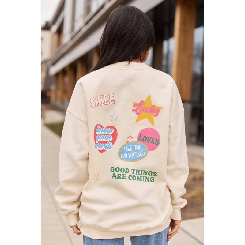 ·Cream crewneck with positive happy lucky stickers good things are coming design