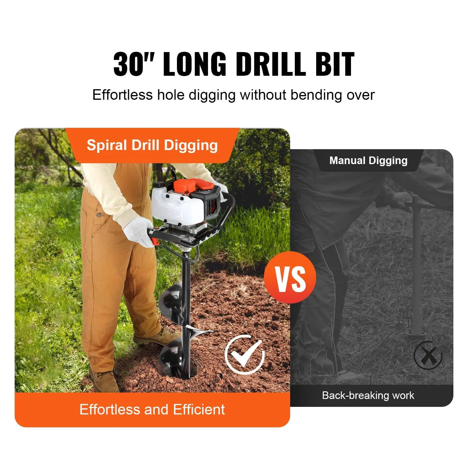 The 30-inch drill bit, paired with a 7.8-inch extension rod, makes digging effortless. The emergency stop switch is conveniently located on the handle for quick shutdowns, and the anti-vibration foam handle provides a comfortable grip.