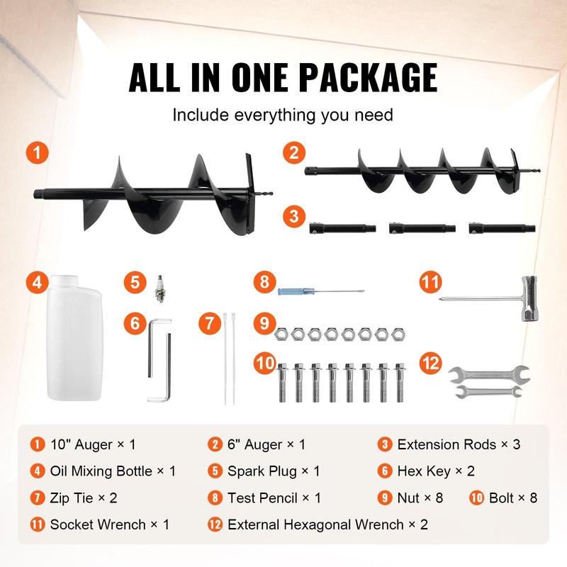 ·Complete Accessories: We ship the main unit and accessories together. It includes 3 extension poles, 2 drill bits, a spark plug, an oil can, and a tool kit. The product is EPA-certified for environmental protection, ensuring its safety and eco-friendliness.