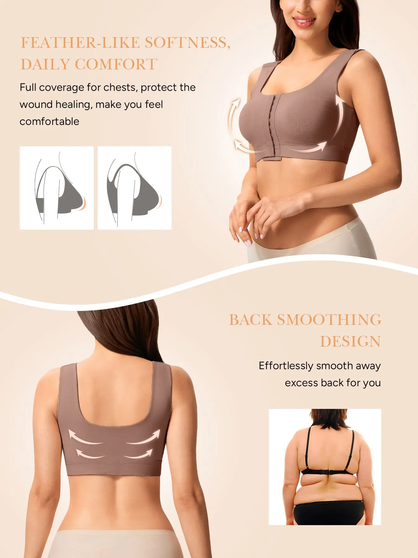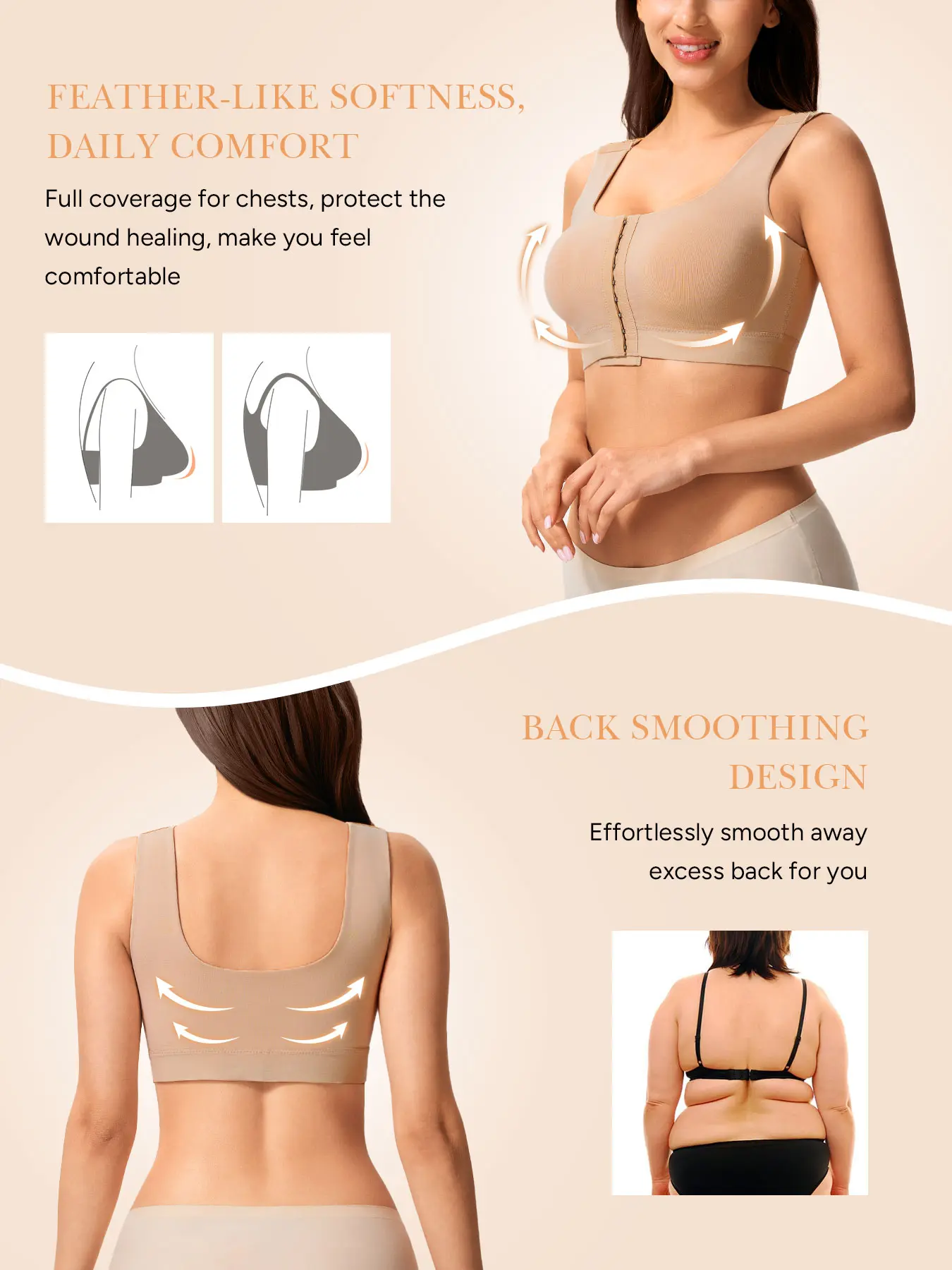 5. Post-Surgery Bra with Front Closure, Adjustable Straps, Seamless Cup, Soft Bottom Edge, Easy Wear and Remove, Square Neck Design, Medium