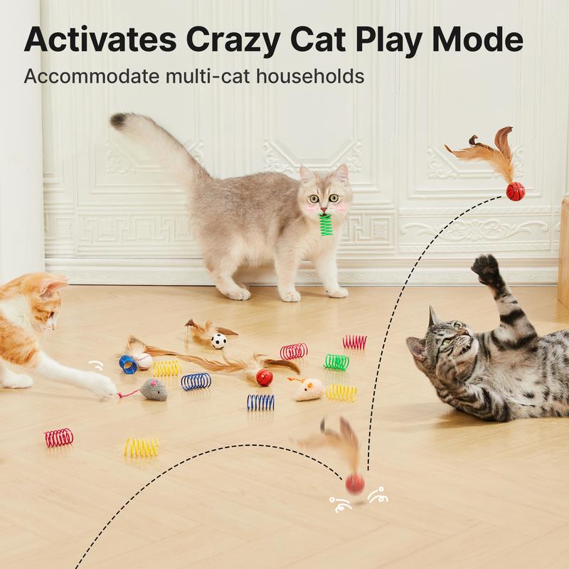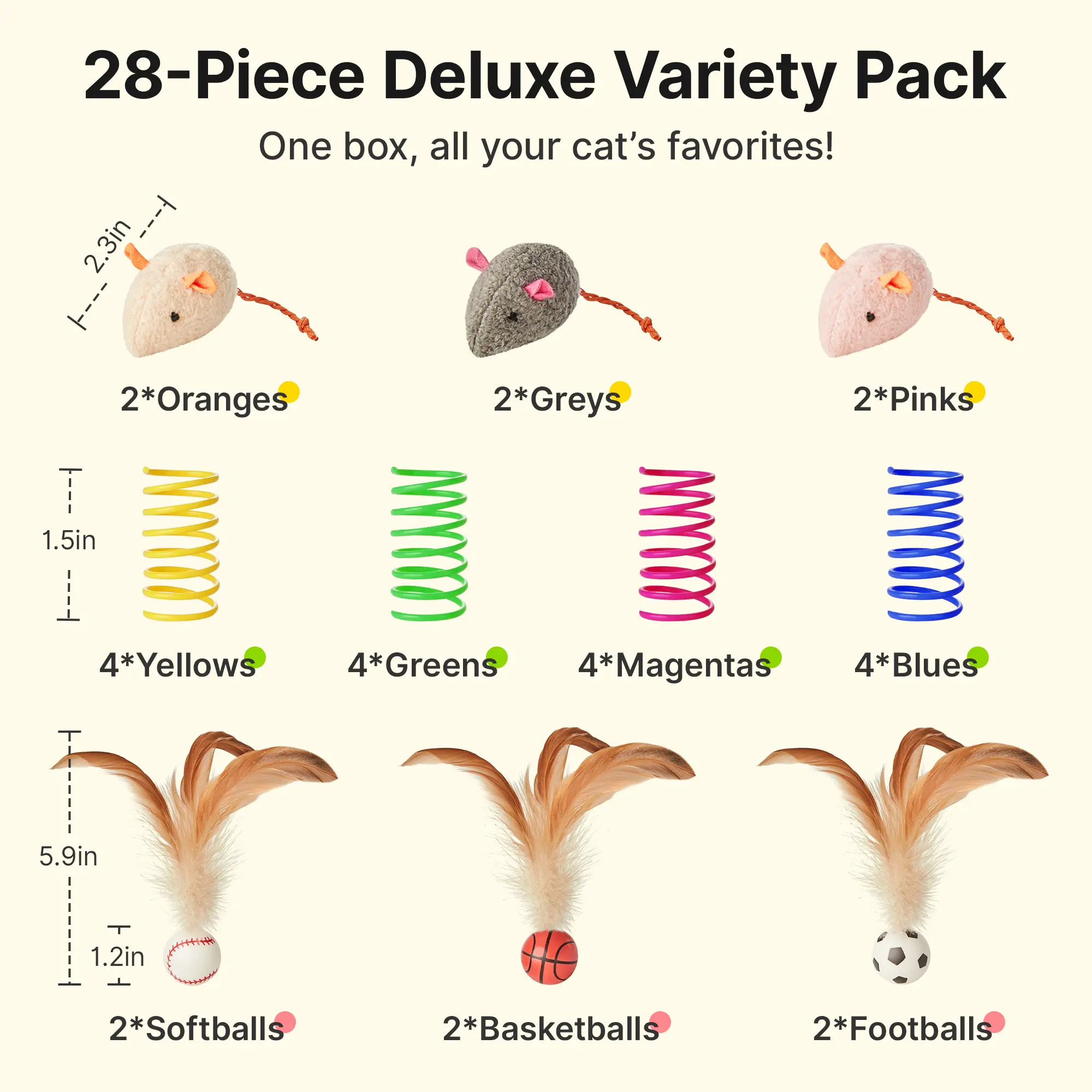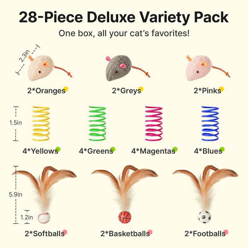 All-in-One Interactive Cat Toy Supplies: This fun-packed cat toy set includes 6 bouncy feather balls, 6 plush mice (2 gray, 2 pink, 2 yellow), and 16 colorful spiral springs. A great value deal with everything your indoor kitten or adult cat needs to stay active and entertained.