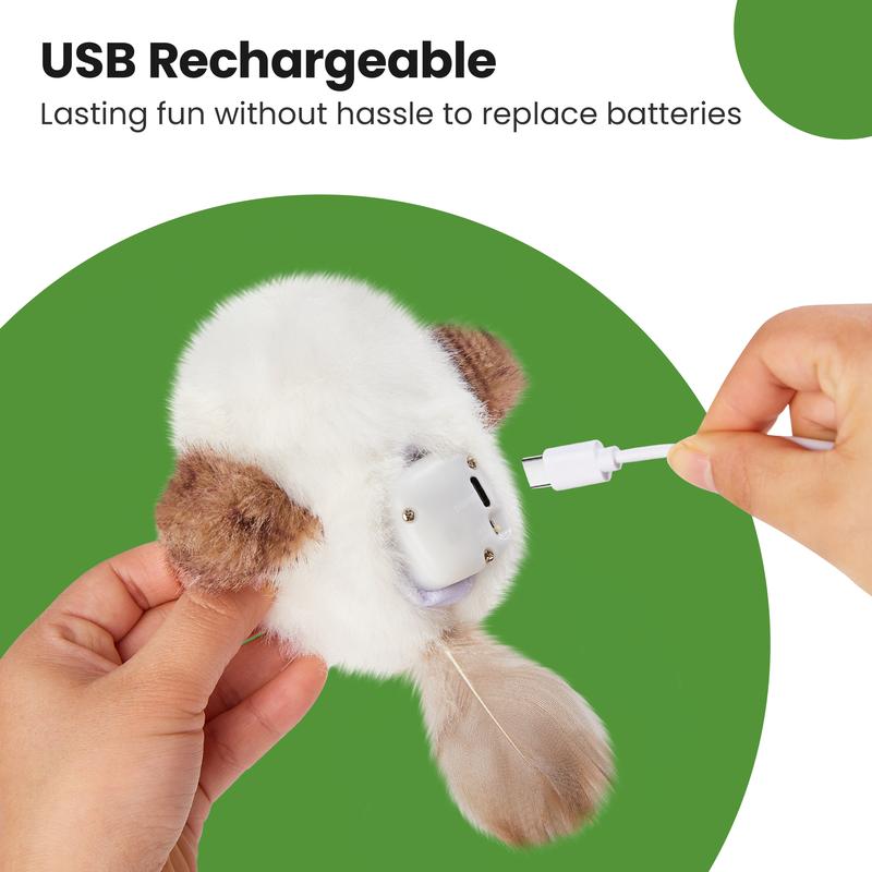 USB Rechargeable - Eliminating the hassle and cost of replacing batteries. A USB cable is included. The built-in charging unit is removable for easy cleaning of the plush pet toy. The bird will remain dormant and quiet when unattended to conserve battery power.
