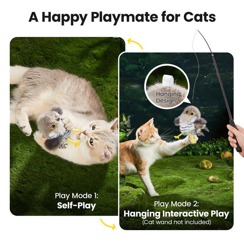 A Chirping Bird: This fluffy tit makes lifelike chirping sounds that will brighten your cat's day. Its tap activation design lets it chirp with lifelike sounds, inviting your cat's every flutter, bite, nibble, and chase.