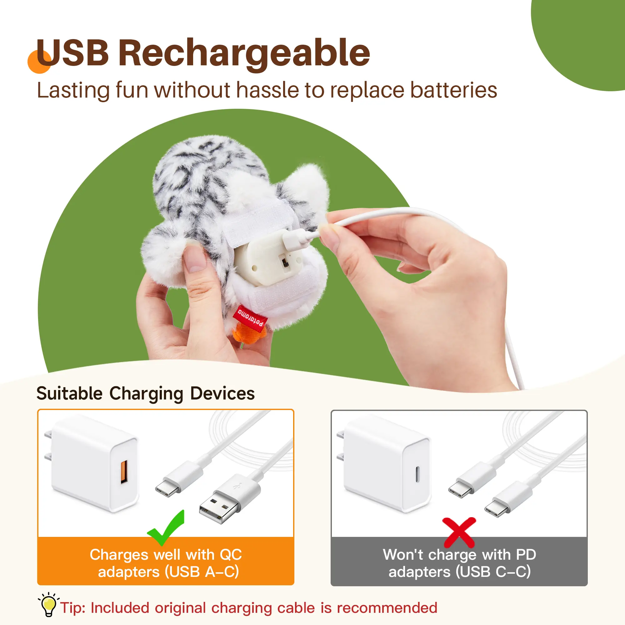 USB Chargeable: this toy is USB chargeable which saves you from the hassle and costs to replace batteries. USB cable is included in the package. The included chargeable mechanism is detachable for convenient cleaning of the plush pet toy. The owl will stay dormant and quiet to save battery power when left alone