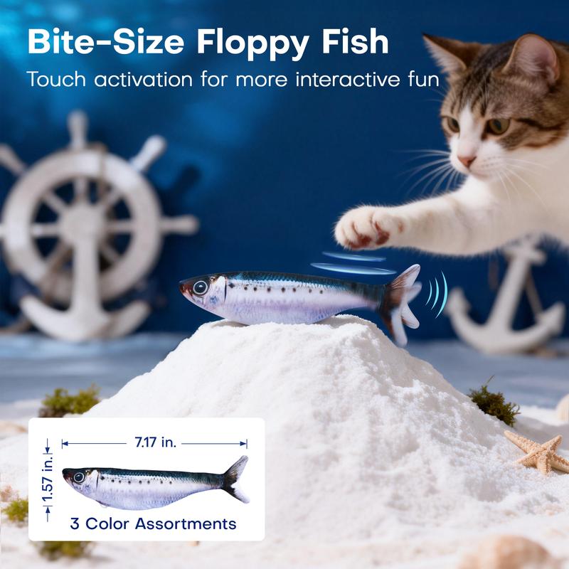 Interactive Fun for Cats – Arrange a Full Fish Feast for Your Cat! This cat kicker toy features a built-in motion sensor that activates the fish toy's flapping when touched, enticing your cat to kick, wrestle, and frolic. Perfect for a Christmas, Thanksgiving, or New Year gift for pet lovers and their furry friends. Realistic Fish Simulation – Watch your cat’s eyes light up! This moving fish toy mimics the lifelike appearance and motion of real fish, keeping cats engaged and active. Just like realistic escape movements of prey, allowing cats to regain the excitement of hunting and improve their strength and agility through play. It’s a boredom-buster and loneliness-reliever. Cozy & Chewable Design – Made from soft, durable plush material, this toy is perfect for chewing and wrestling and will not fade after use. It can be replaced and cleaned after the kitten gnaws. Rechargeable and Convenient – Say goodbye to disposable batteries! This flopping fish toy comes with a USB charging cable and features a detachable motor for easy cleaning.  With a 150mAh rechargeable battery, it lasts longer. Mini Size & Durability – At 7.1 inches long, this cat toy is the just right size for all breeds, especially kittens. It has a 3-mode flapping system (fast, slow, and intermittent), providing endless entertainment for your cat. Simply unzip the fish, flip the switch, and tap to activate the flapping.