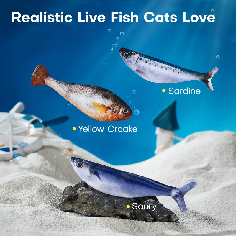Potaroma Bite-Sized Realistic Flopping Fish Cat Toy, 3-Pack, Interactive & Rechargeable, with 3 Flapping Modes - Sardine, Saury, Yellow Croaker, 7.1 Inches, Durable Plush, Auto-Activated Motion for Cats