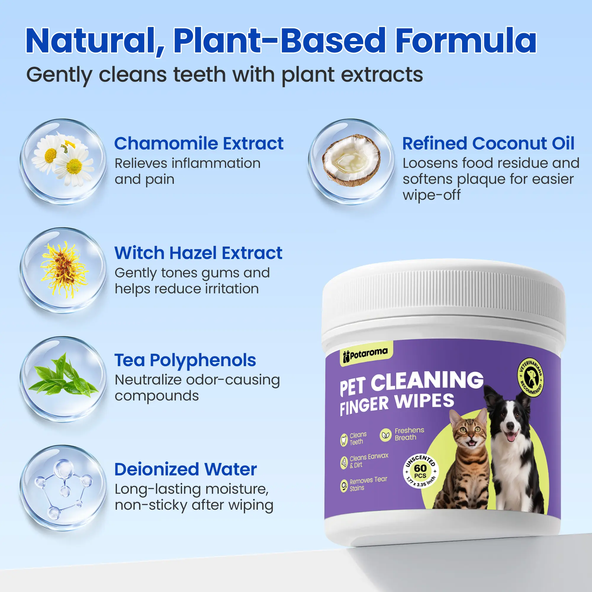 Dental Wipes: Our pet teeth cleaning wipes are specially designed for dogs and cats prone to bad breath, gum issues, or plaque buildup. The dual-action formula helps reduce recurring plaque, gently soothe and nourish gums. Our formula ensures a soft, effective clean, while moisturizing and soothing sensitive areas.