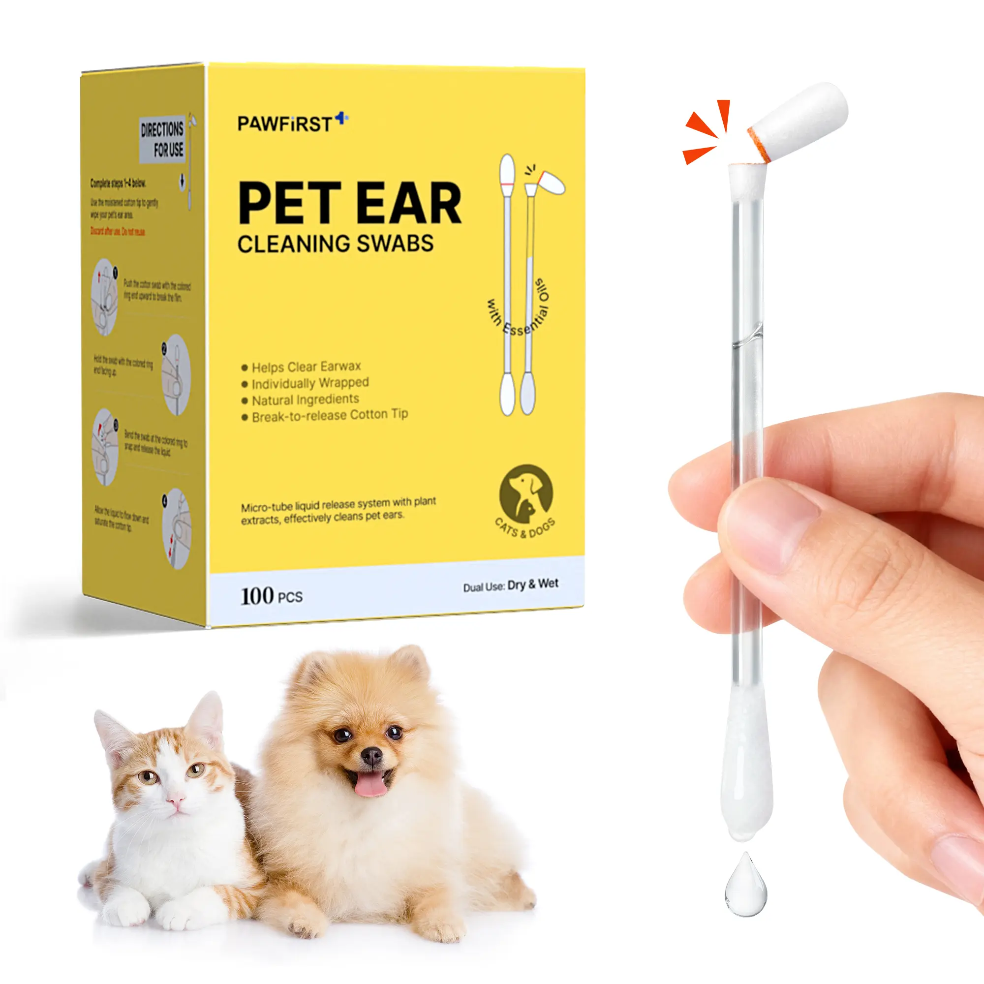 Includes 100 swabs in a sturdy box. Easy to use: Break Saturate Gently wipe the outer ear (do not insert deeply). For cats & dogs.