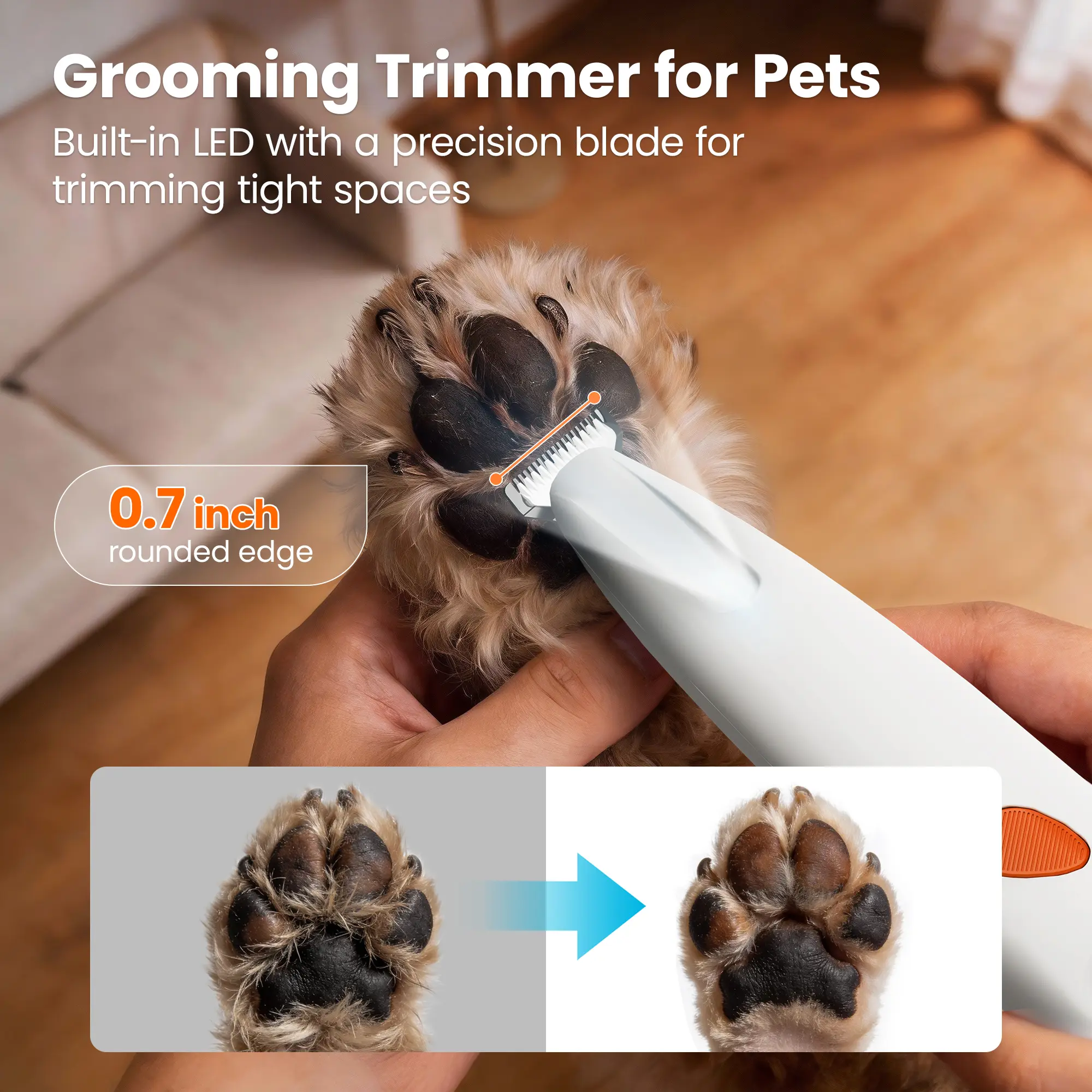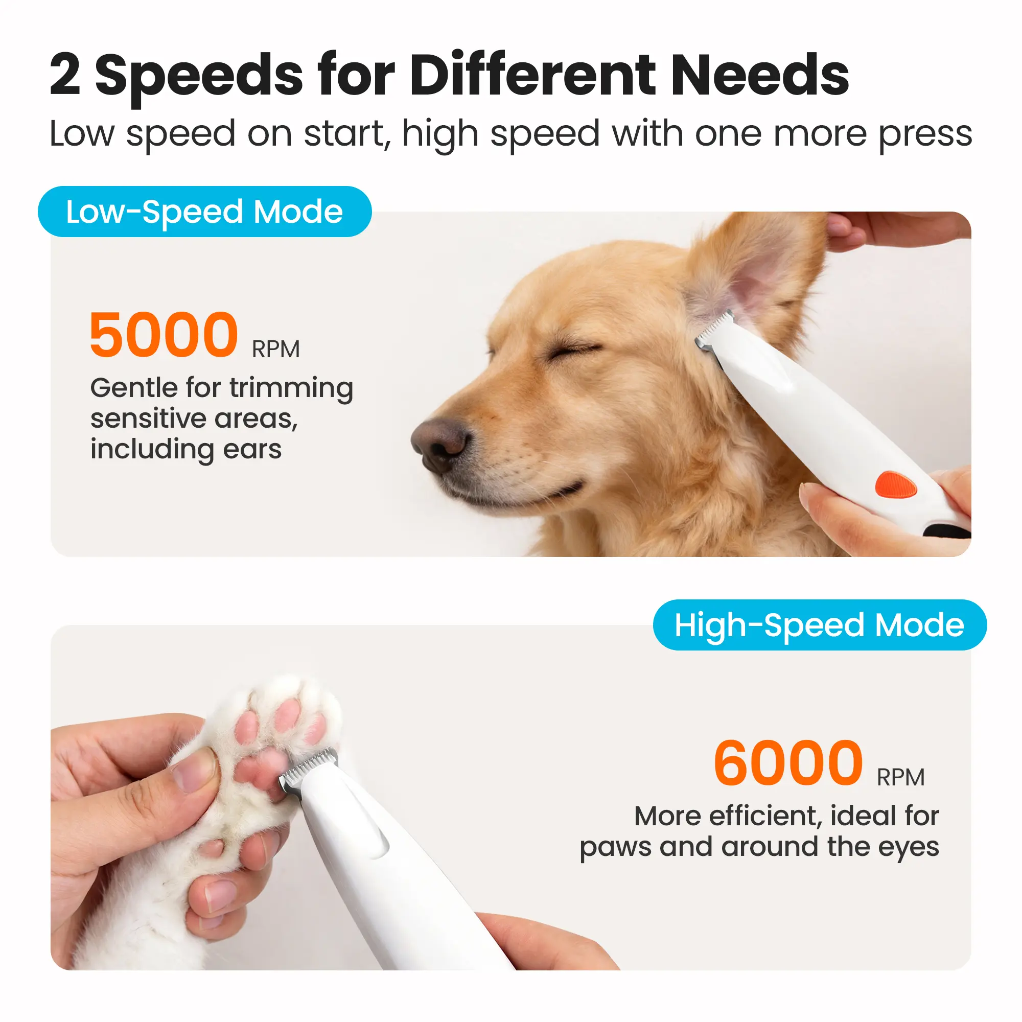 Features two-speed control (low/high) to match different fur thicknesses, plus an LED light to illuminate dark spots (like between toes or under paws).