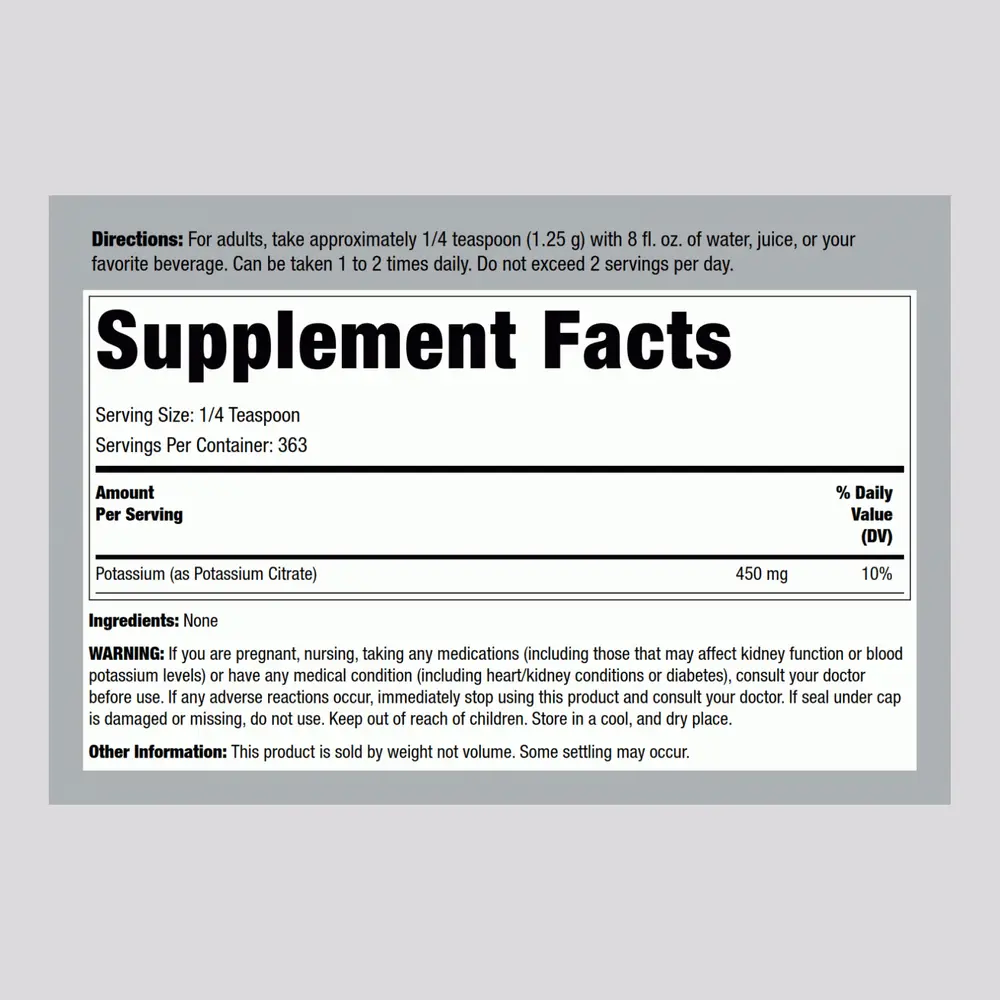 Piping Rock’s Potassium Citrate Powder offers a highly bioavailable form of Potassium at an exceptional value. Each ¼ teaspoon serving delivers 450 mg of Potassium in convenient powder form. Our premium formula is vegan-friendly, sodium-free and mixes perfectly in water, juice, or your favorite beverage for nutritious refreshment.