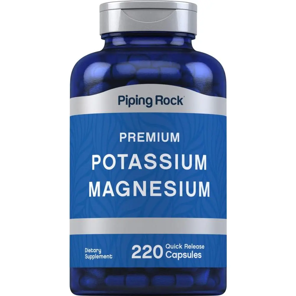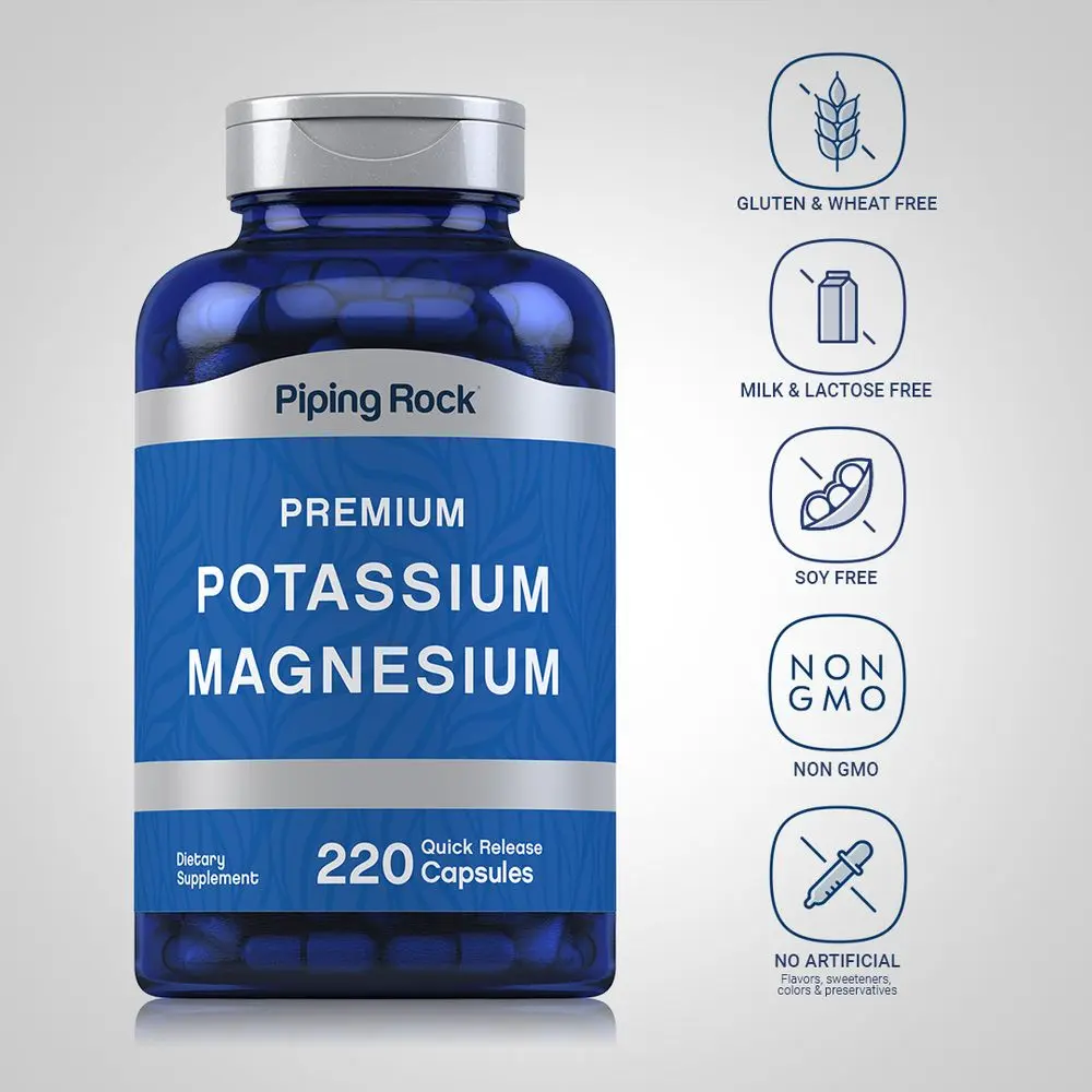 Support your routine with Piping Rock's Potassium Magnesium! This highly innovative formula provides 99 mg of Potassium (as Potassium Chloride) and 400 mg of Magnesium (as Magnesium Oxide) per serving in super convenient quick release capsules. Our gluten-free and non-GMO formula contains no preservatives, delivering just what you need to help meet your supplement goals.