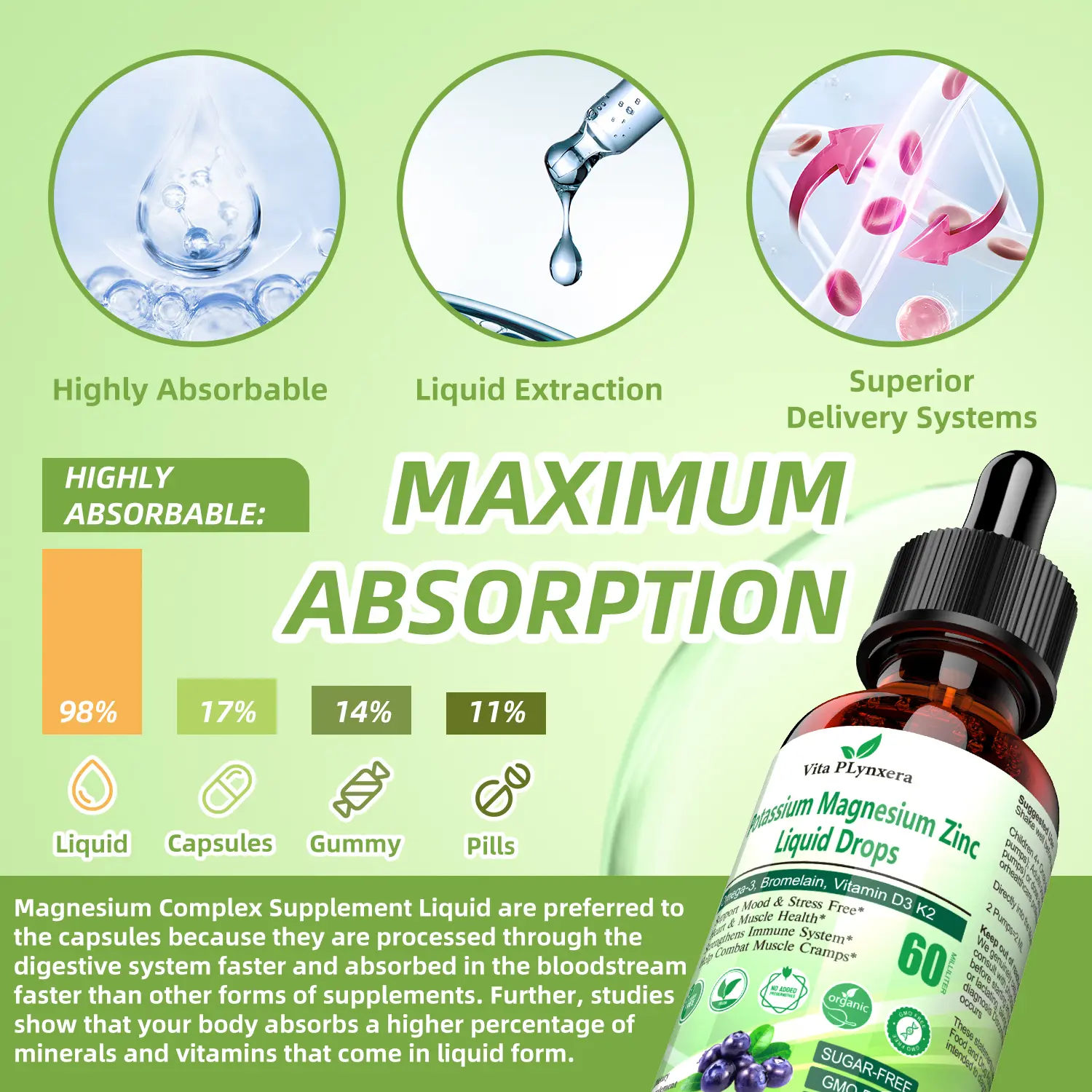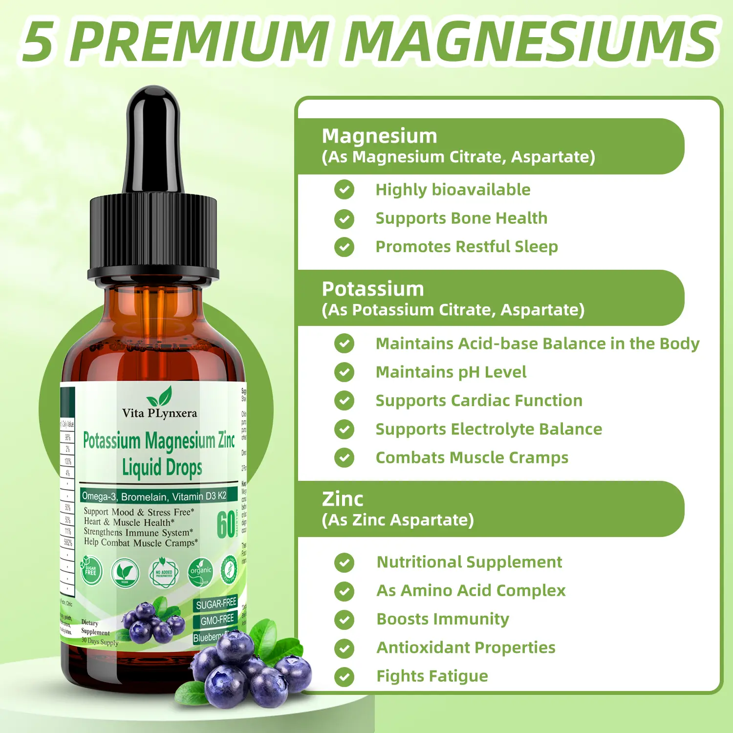 Our powerful Magnesium and Potassium supplement provides these essential nutrients in their uniquely bioavailable chelated forms of aspartate, citrate. Vegan Magnesium Potassium Drops is Super concentrated for max strength and easy to absorbed.