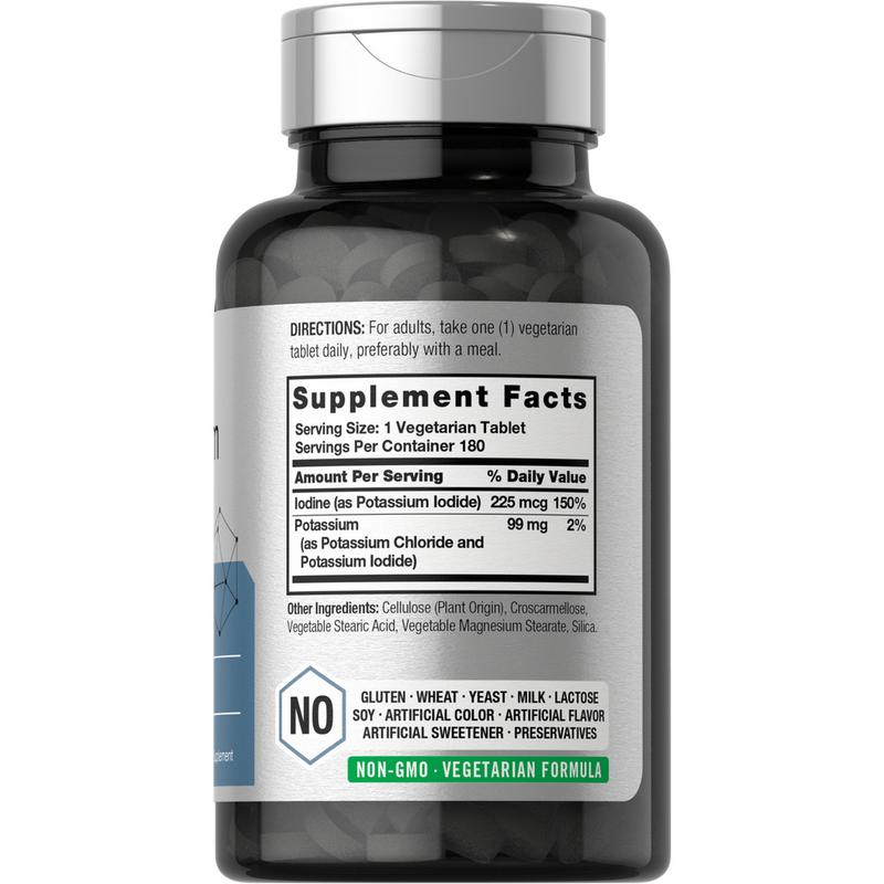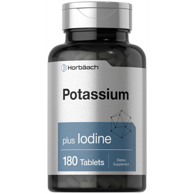 Experience Horbaach's Potassium Plus Iodine! This highly innovative formula now delivers 99 mg of Potassium (as both Potassium Chloride and Potassium Iodide) plus 225 mcg Iodine (as Potassium Iodide) for additional support. Vegetarian tablets are gluten free and non-GMO, making it a popular supplement of choice for adult men and women everywhere. Enjoy our 180-count supply today!
