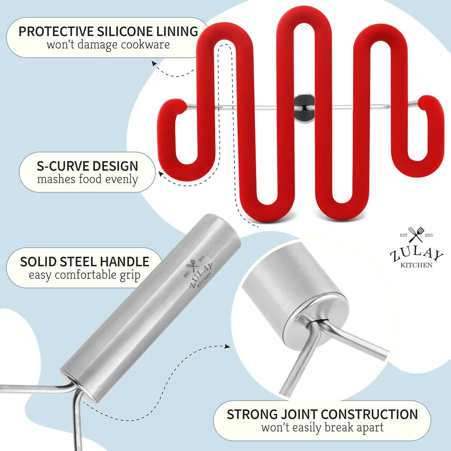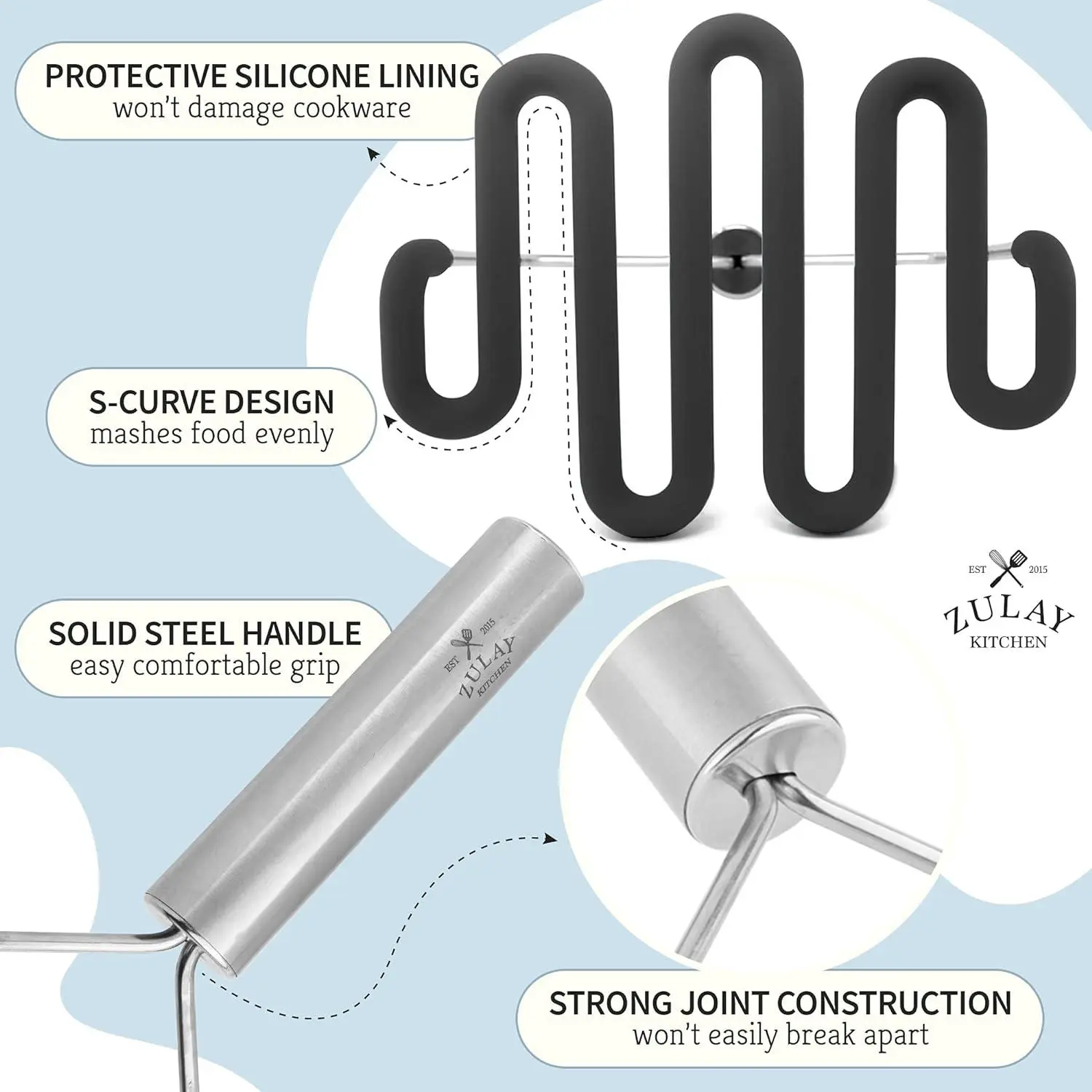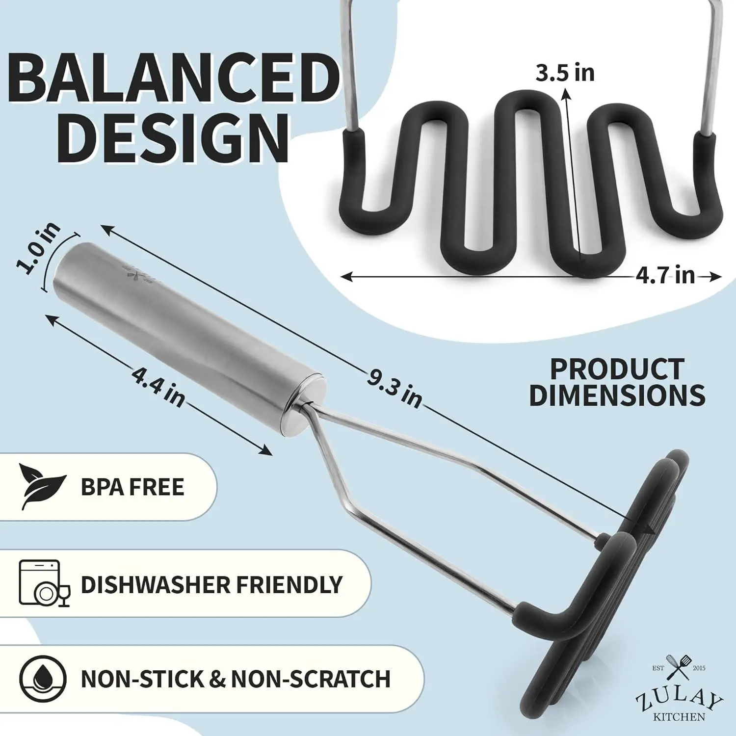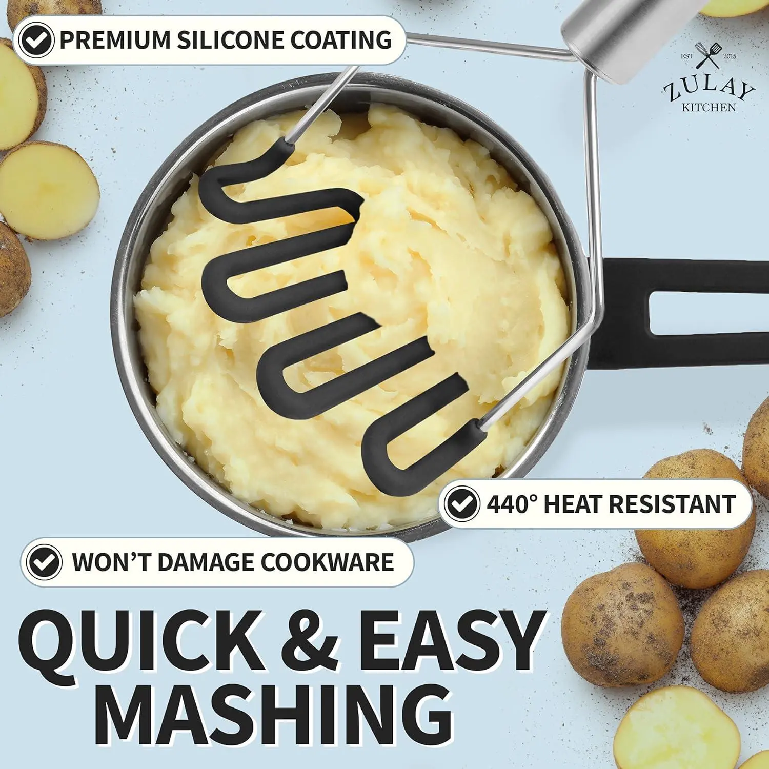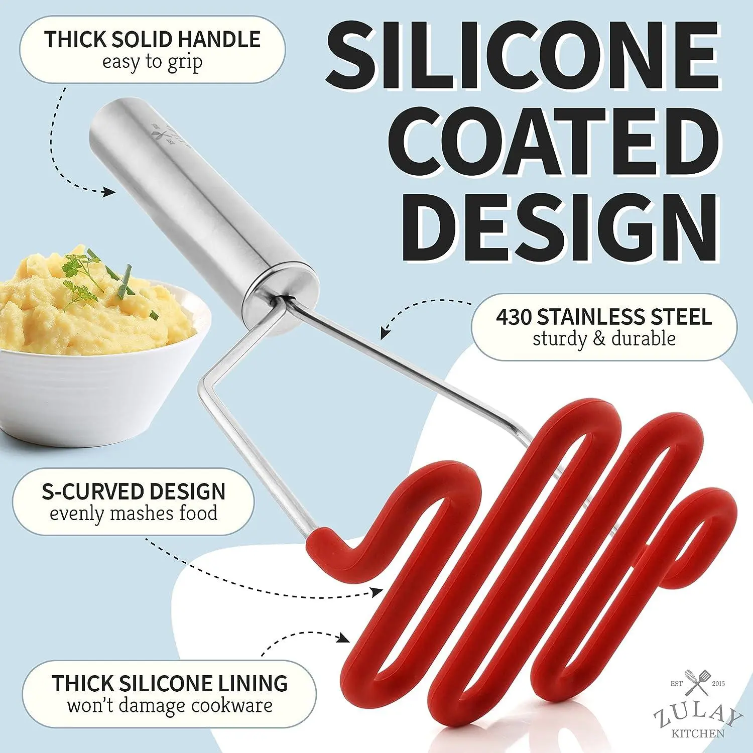 Our stainless steel potato masher features a protective silicone coating, ensuring smooth, fluffy mashes without damaging non-stick cookware. Ideal for potatoes, avocados, bananas, and more, this durable masher will quickly become your kitchen favorite.