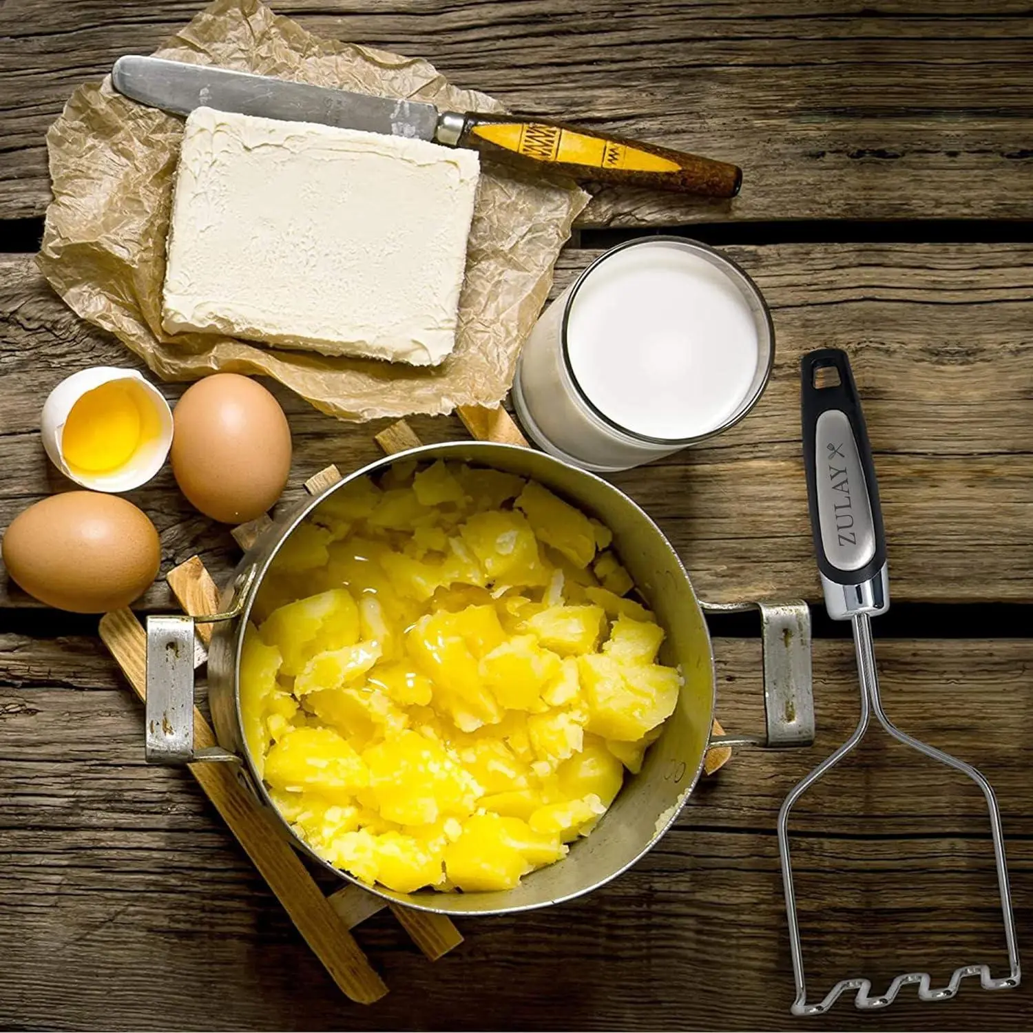 Make delicious mashed potatoes from scratch with the Zulay Kitchen Potato Masher, designed for quick, easy mashing. This stainless steel masher helps you achieve perfect texture and consistency, cutting down on prep time and getting food to the table faster. Versatile enough for potatoes, yams, avocados, and more!