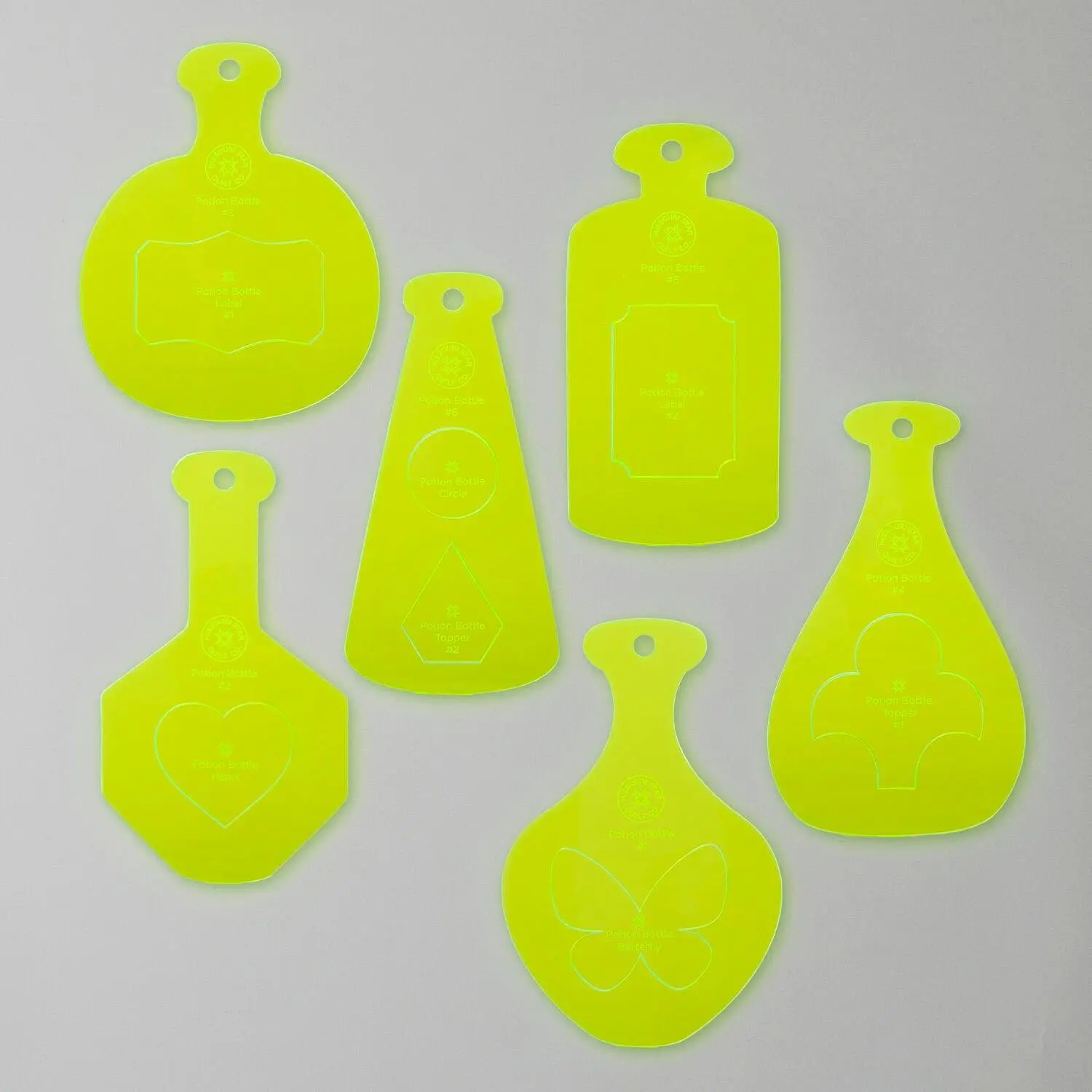 Conjure up some frighteningly cute Halloween projects with the Missouri Star Potions and Bottles Template Builder Set! Six bottle templates have nested shapes inside, for a total of 13 template pieces. Includes bottles, labels, bottle toppers, a butterfly, and a heart. Durable acrylic.