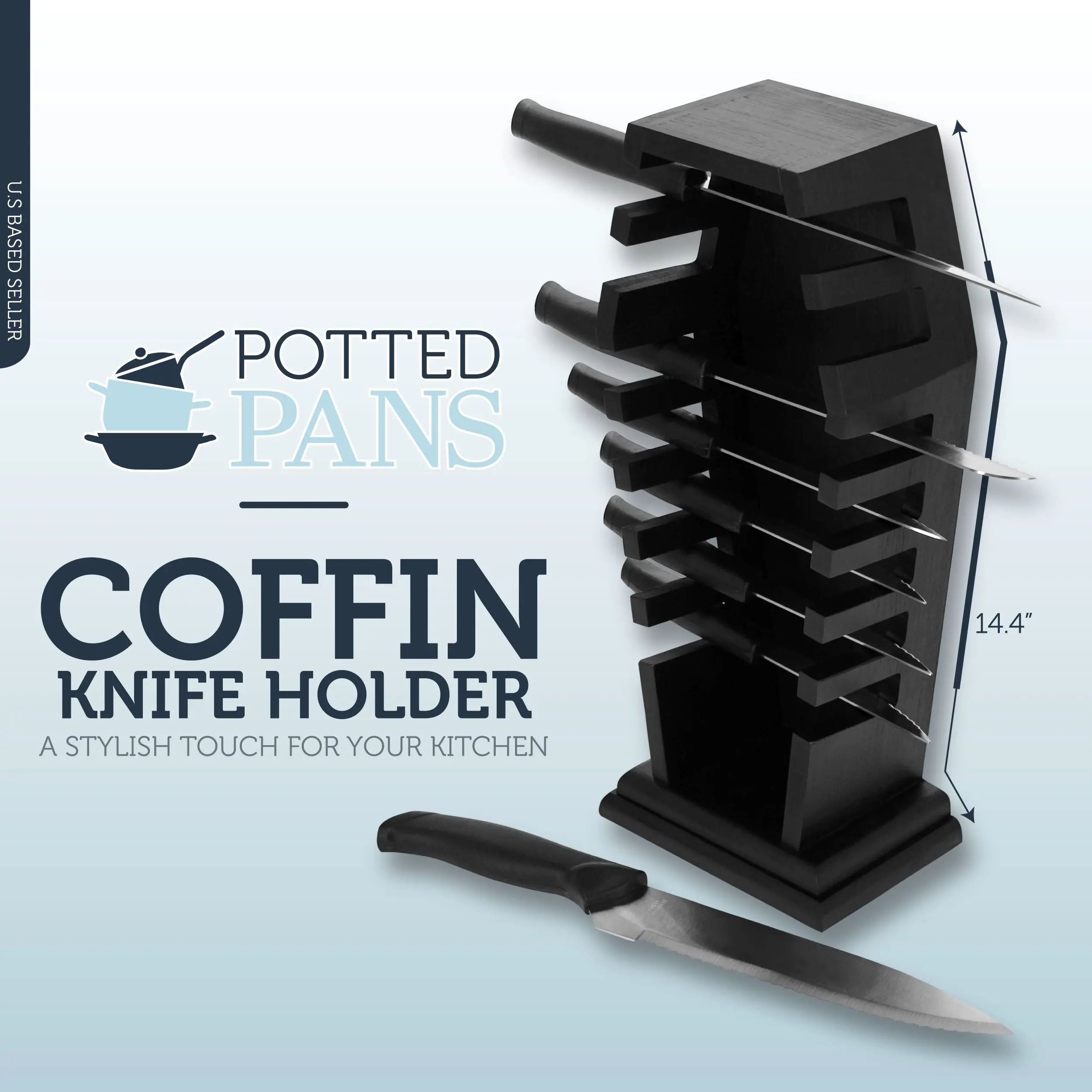 [Oddities Decor]: Complete your Halloween kitchen with the Potted Pans Coffin Shaped Utensil Holder Knife Organizer for Countertop Display