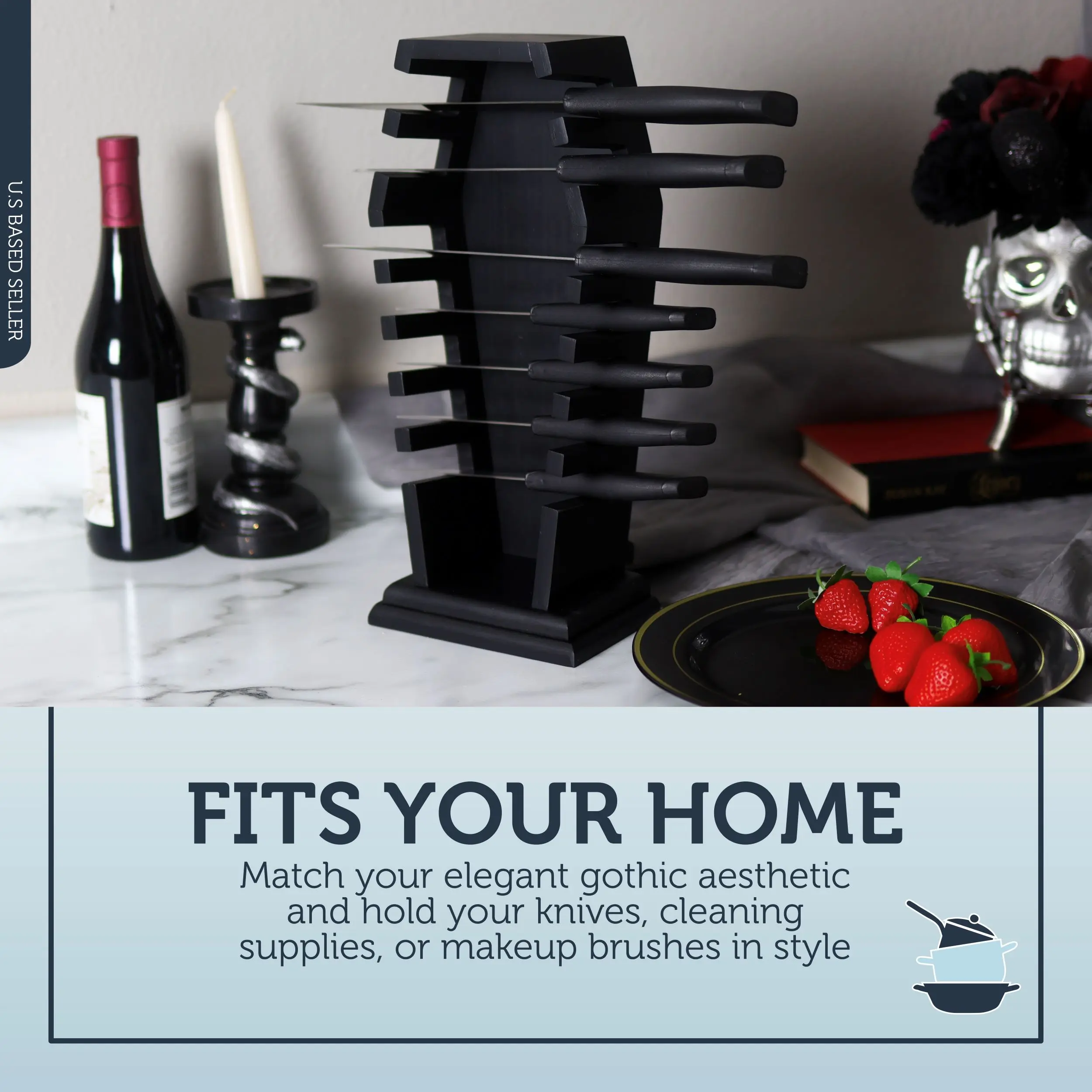 Whether you are someone who changes out decorations with every holiday or someone who displays their spooky gothic household items as everyday decor, this Kitchen Knife Holder Coffin Decor from Potted Pans is the perfect addition to your gothic kitchen accessories. With cradled slots for up to 7 kitchen knives, you can display your selection of blades on your countertop with added spook. The 6.1 x 3.5in (15.5 x 8.9cm) base keeps this 14.4in (36.5cm) tall bamboo Halloween utensil holder upright with decreased risk of tipping. Use to showcase your skull kitchen accessories such as horror movie engraved wooden spoons, or serial killer themed spatulas. Alternatively use to house your blush brush, eye shadow palette, and other goth makeup accessories on your witchy bedroom vanity.