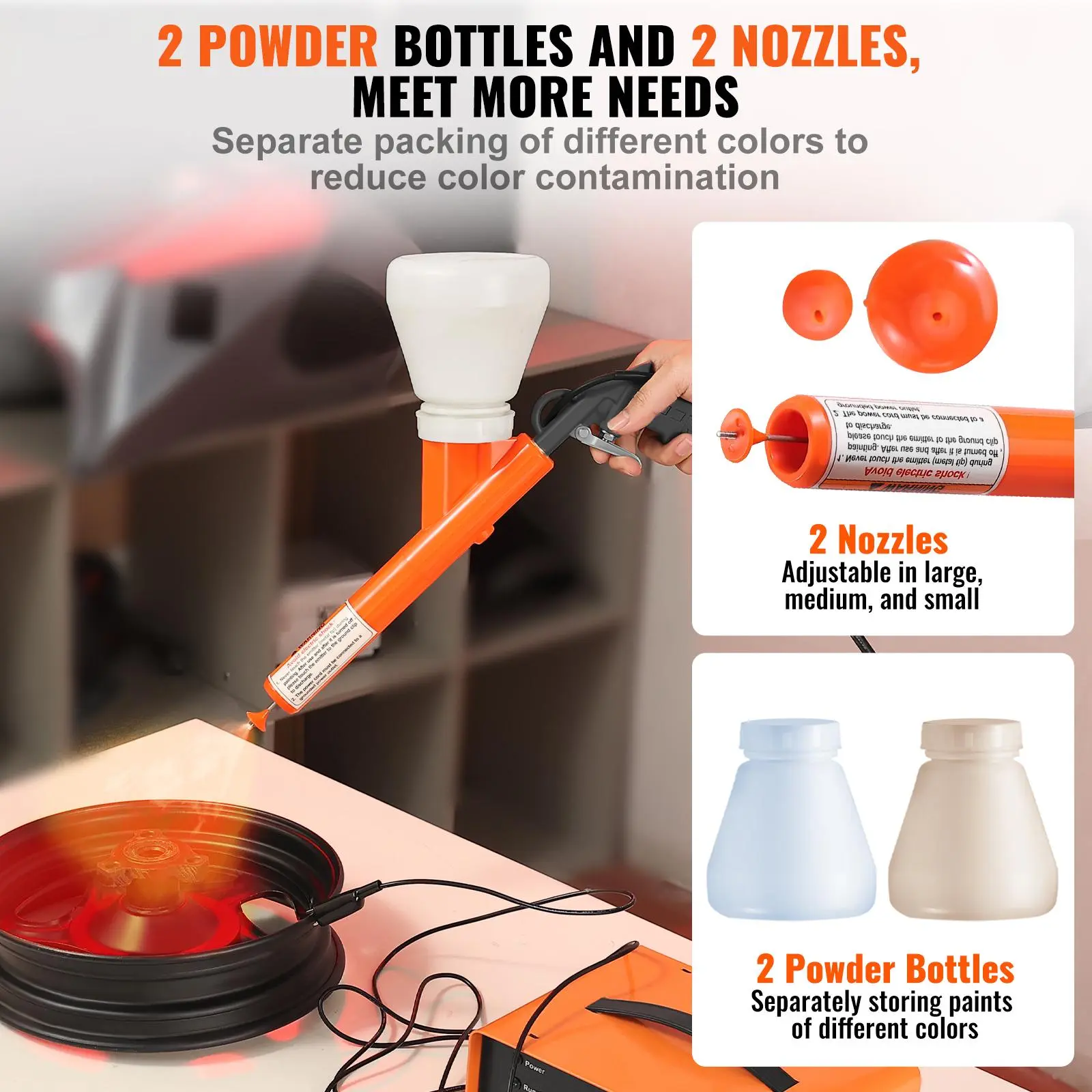 • 2 Powder Bottles and Nozzles: Easily switch between colors without the hassle of cleaning between powder changes. Each bottle is dedicated to a specific color. Our powder coating kit reduces the risk of color contamination due to incomplete cleaning and significantly improves work efficiency.