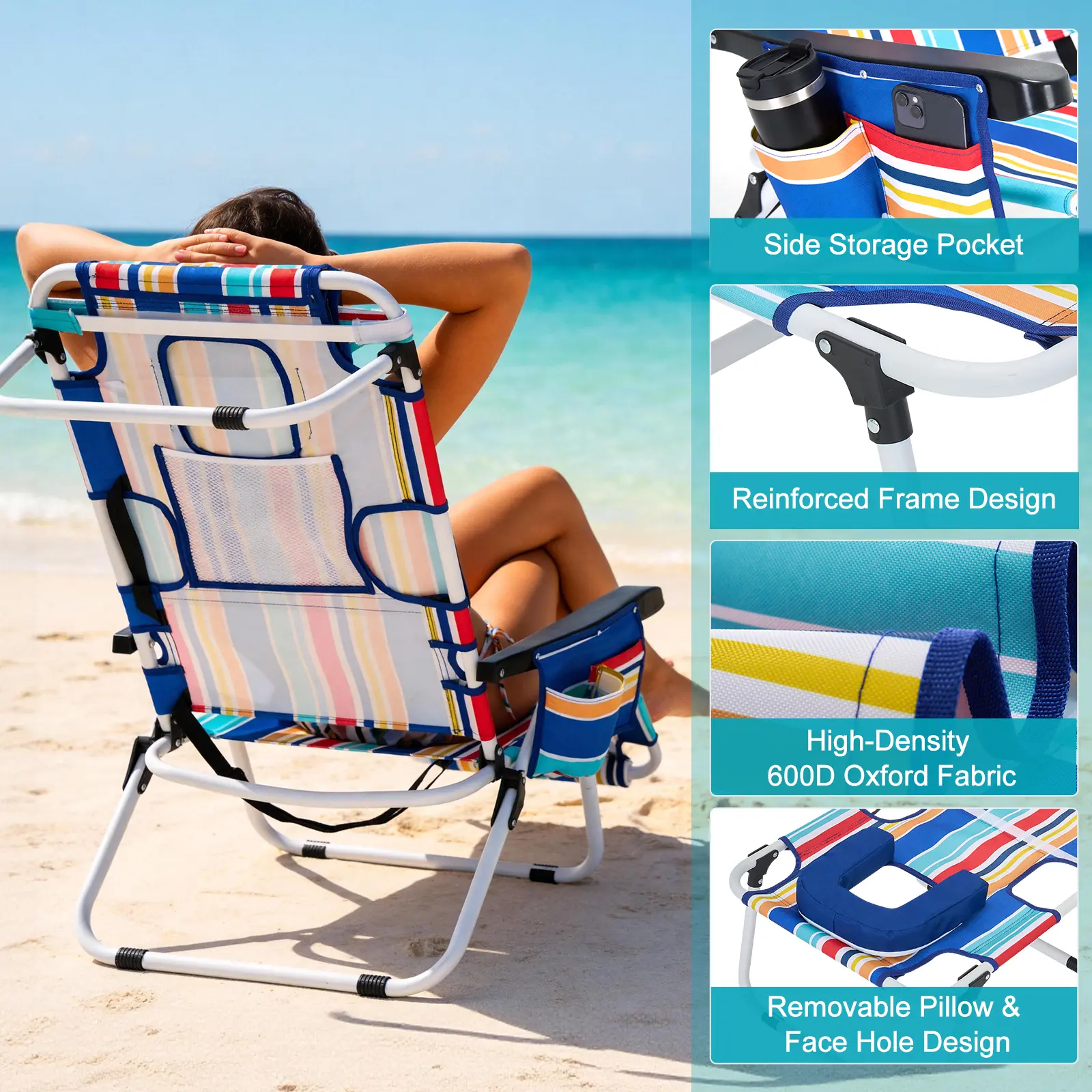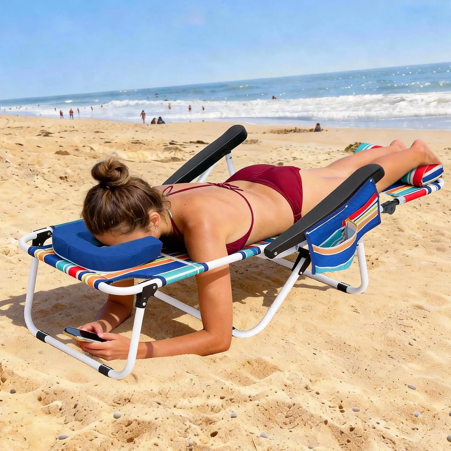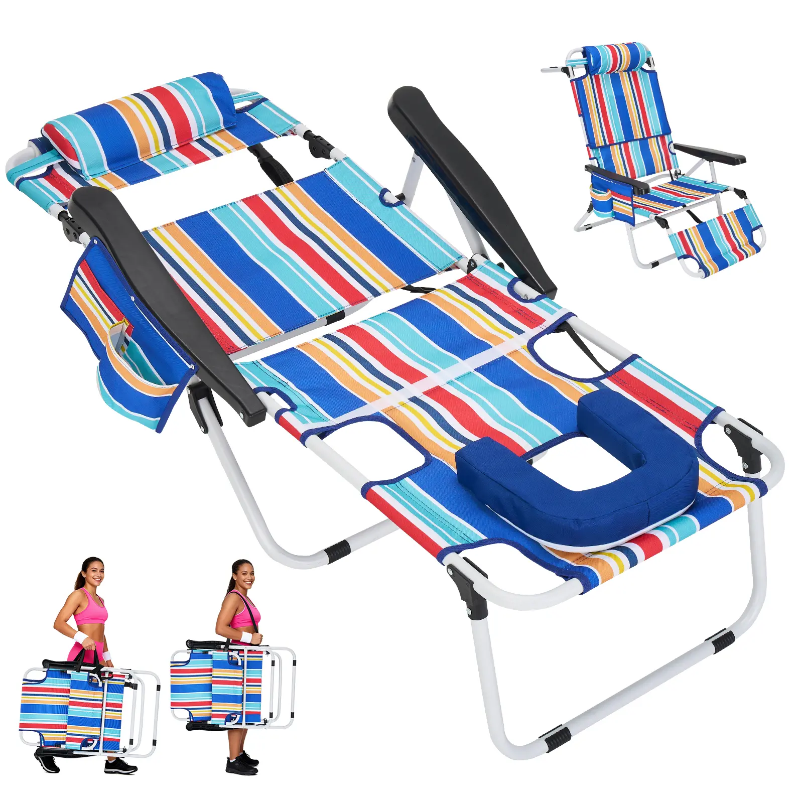 ·FACE-DOWN COMFORT DESIGNRemovable pillow with face hole + arm slotsLie face down comfortably without neck pressurePerfect for sunbathing, reading, relaxing, or quick naps