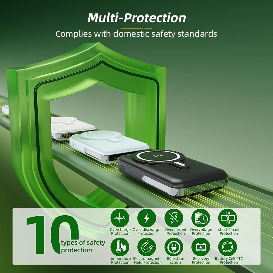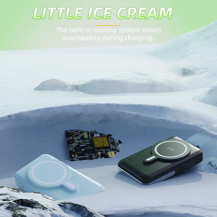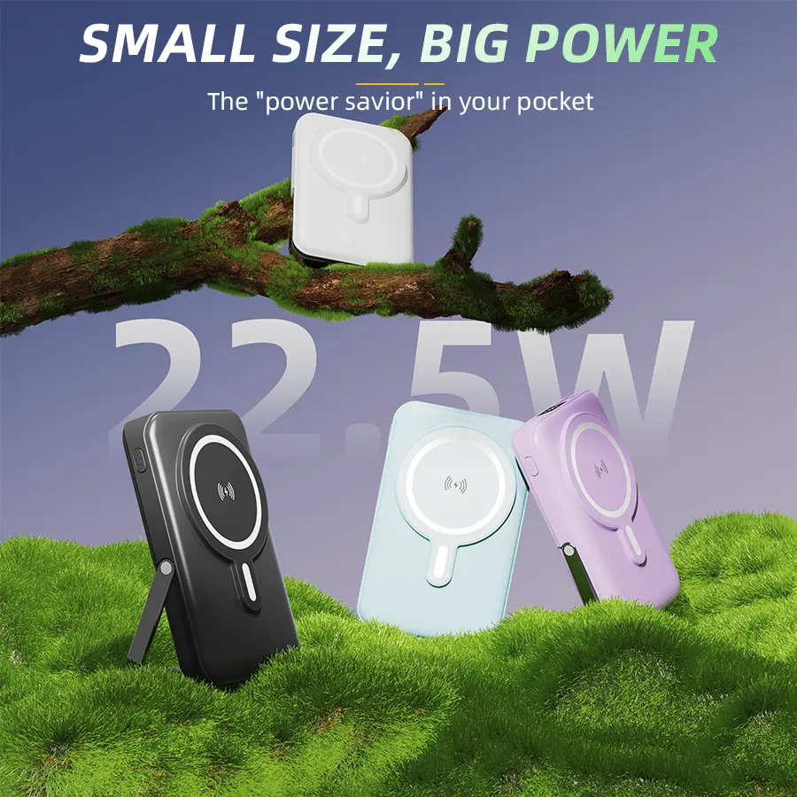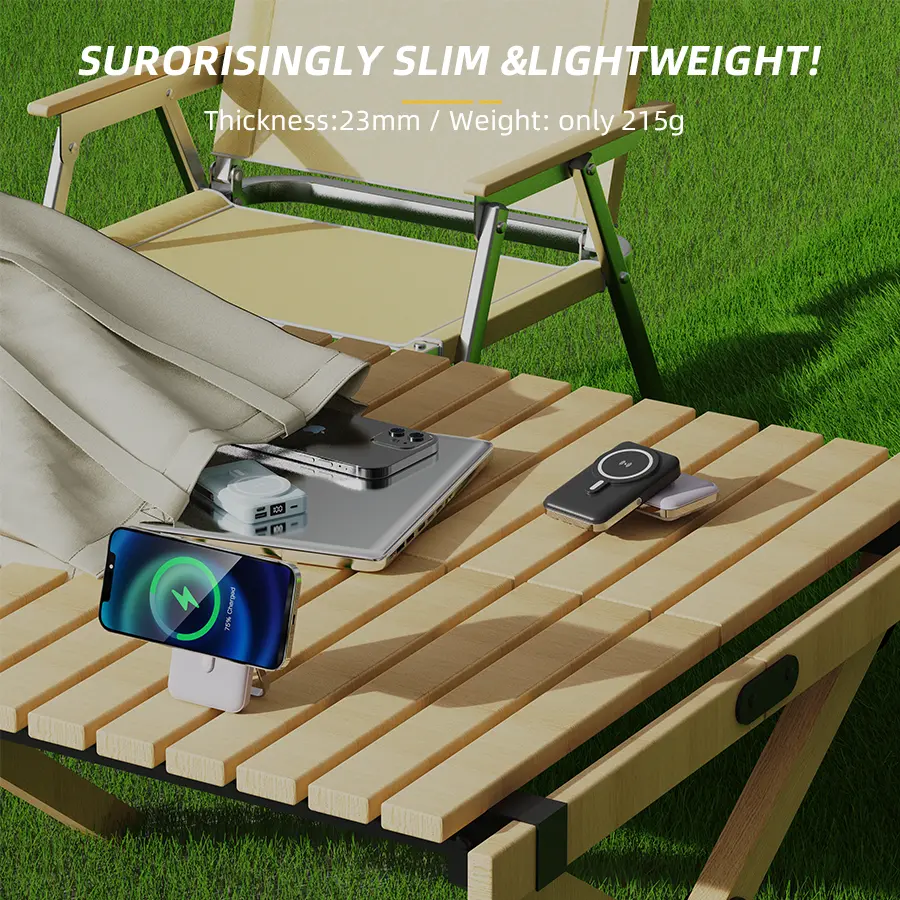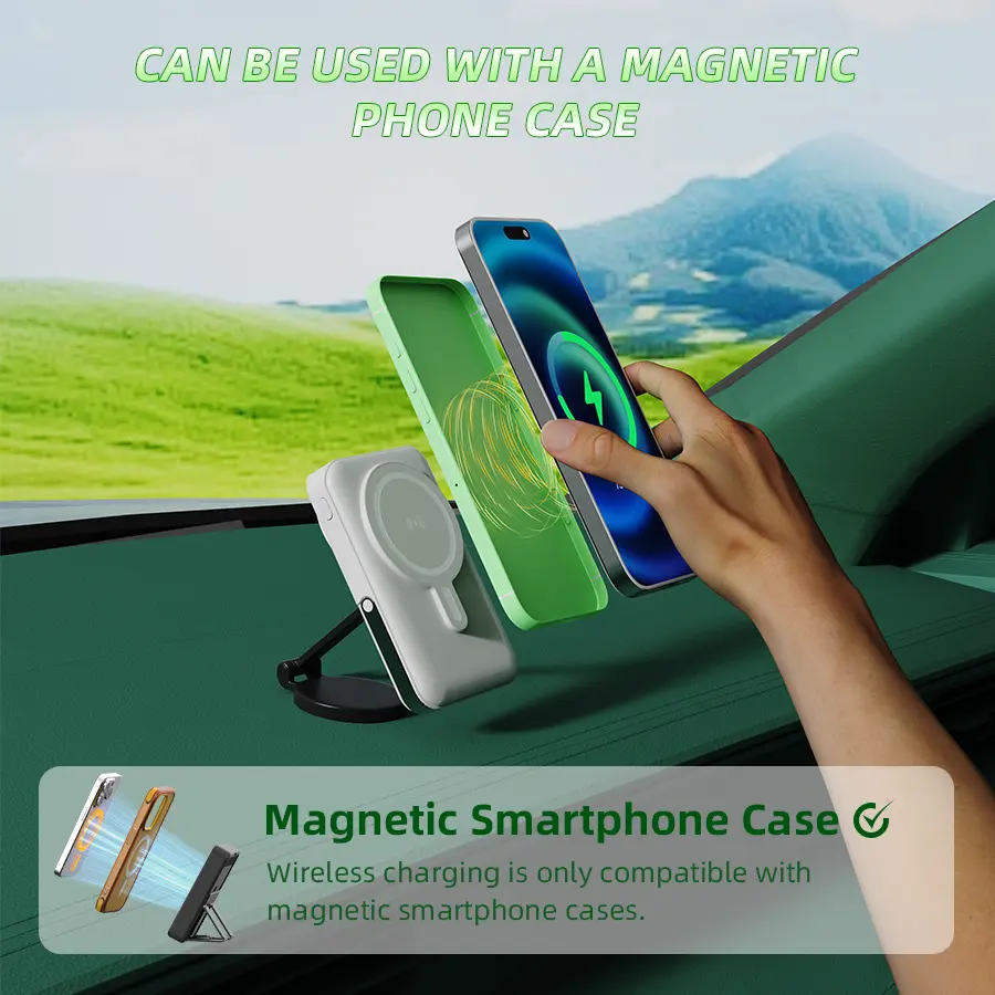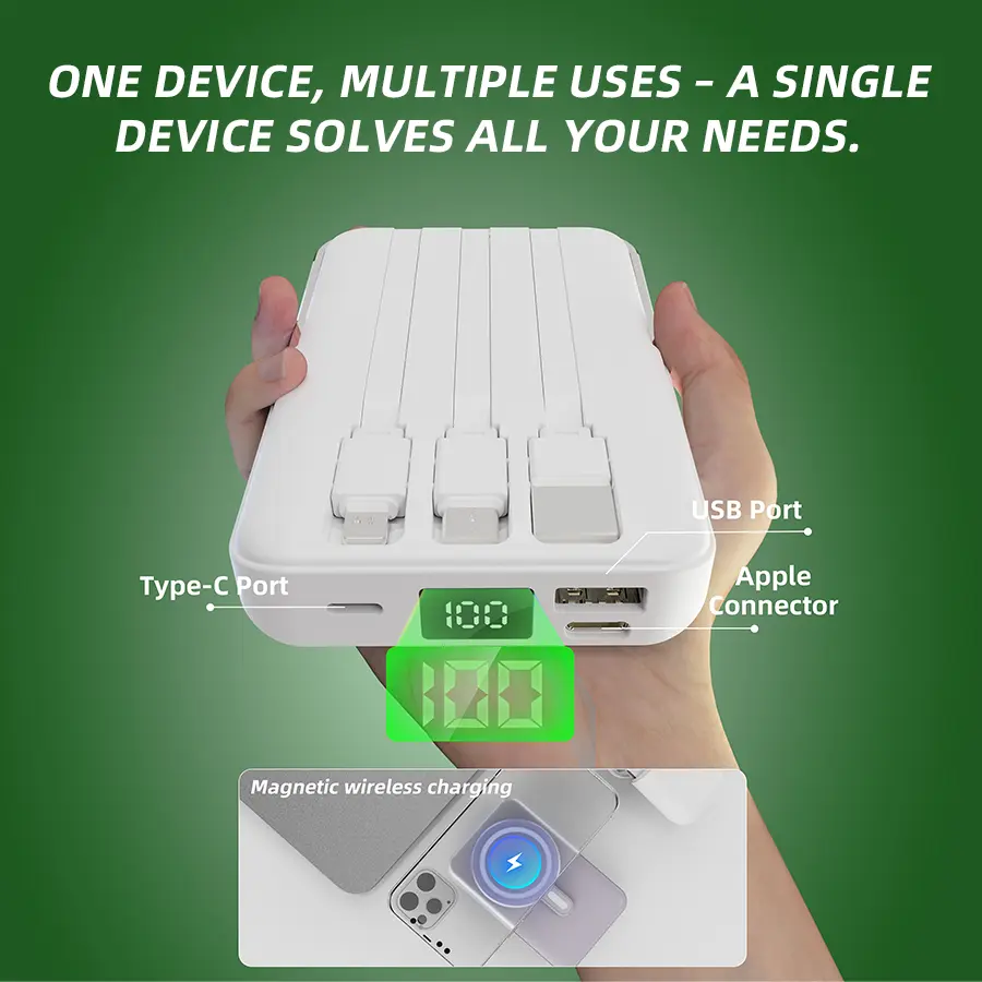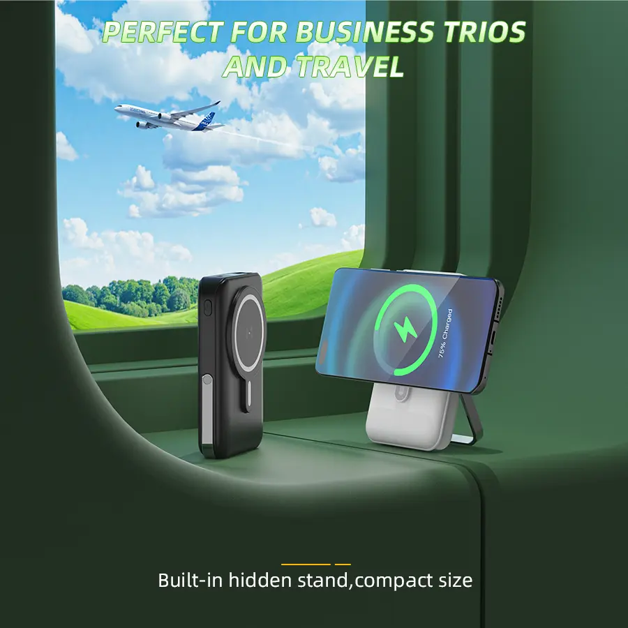 Equipped with a magnetic power bank, charge your device wirelessly. The foldable feature ensures compact storage when not in use. The LED display provides real-time battery levels, keeping you informed. This charger simplifies charging while maintaining a sleek look. Charge your iPhone with ease and style!