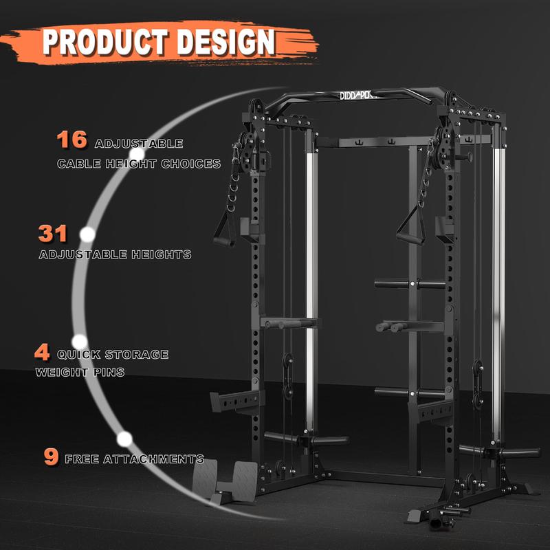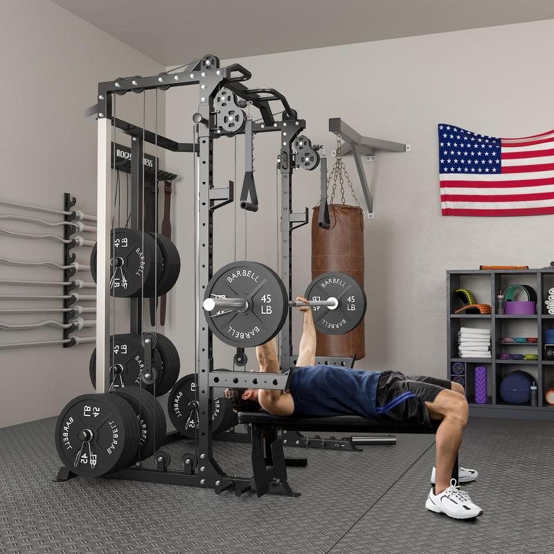 Professional Accessories Included- Various Accessories: Includes landmine, lat pull down bar, cable bar, T-bar, dip bars, J-hooks, safety spotter arms, resistance band pegs, exercise handles, and foot pedal.- High Weight Capacity: Up to 2500 lbs and 16 selectable cable heights for a safe and stable workout experience.