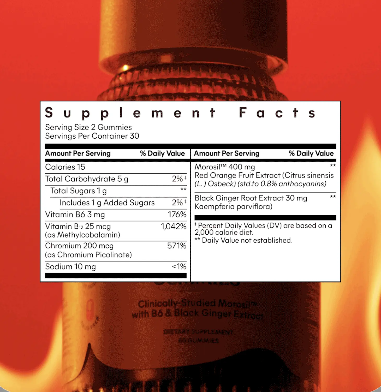IngredientsVitamin B12 (as Methylcobalamin) 50 mcg 2,083% Chromium (as Chromium Picolinate) (Chromax®) 600 mcg 1,714% Gymnema Sylvestre Leaf Powder 100 mg †,Vitamin B6 3 mg 176% Vitamin B12 (as Methylcobalamin) 25 mcg 1,042% Chromium (as Chromium Picolinate) 200 mcg 571% Sodium 10 mg Morosil™ Red Orange Fruit Extract (Citrus sinensis (L.) Osbeck) (std. To 0.8% anthocyanins) 400 mg ** Black Ginger Root Extract (Kaempferia parviflora) 30 mg Other Ingredients: Tapioca Fiber, Organic Cane Sugar, Water, Pectin, Natural Flavors, Citric Acid, Agar, Sodium Citrate, Coconut Oil, Carnauba Wax, Stevia Leaf Extract.,Tapioca Syrup, Raw Cane Sugar, Non-GMO Palm Oil, Gum Arabic, Natural Flavors, Sunflower Lecithin, Citric Acid, Fruit and Vegetable Juice (Color), Sea Salt.