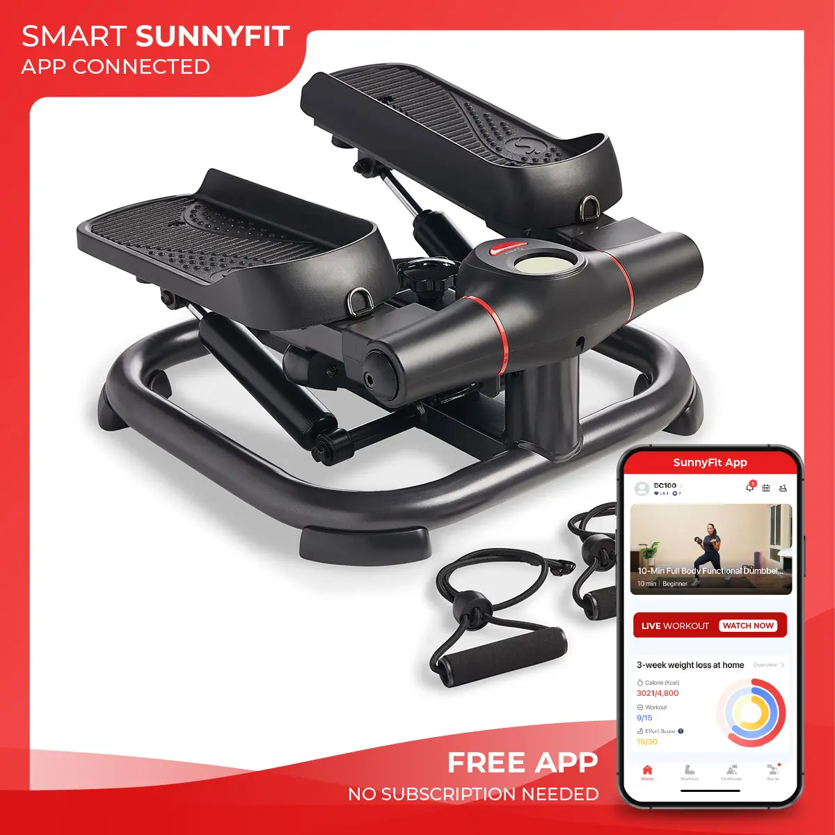 This 2-in-1 workout tool includes resistance bands that engage multiple muscle groups, providing a comprehensive workout targeting legs, back, core, and arms. It features Bluetooth connectivity with the SunnyFit App for progress tracking, goal setting, and virtual stepper training, offering a smart fitness experience with 1000+ workouts and 10,000+ routes worldwide.