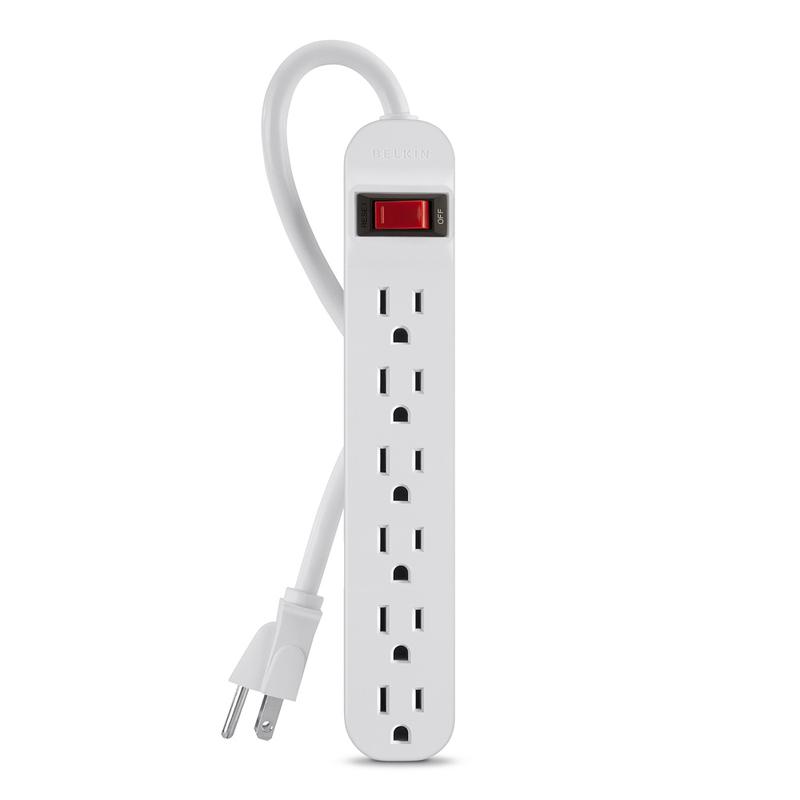 Simply powerful. This compact power strip delivers efficient power distribution without sacrificing space. Featuring six standard outlets, it's perfect for organizing your electronics and devices. A convenient red on-off switch provides added control. Backed by Belkin's commitment to quality, the 5-foot heavy-duty power cord ensures dependable performance and longevity.