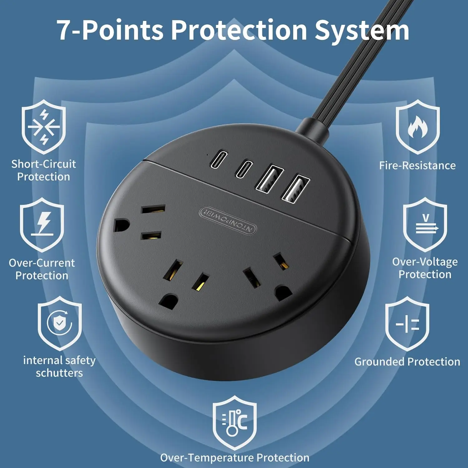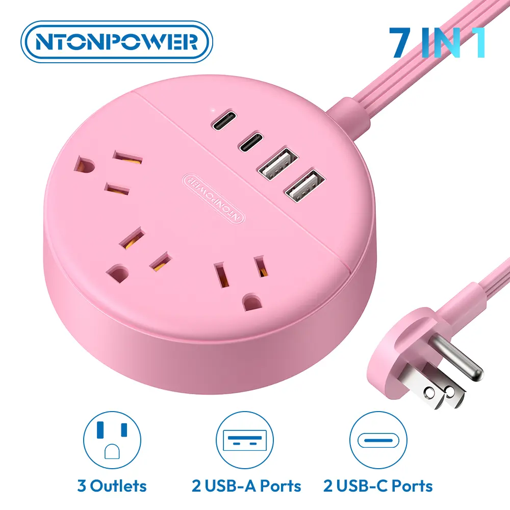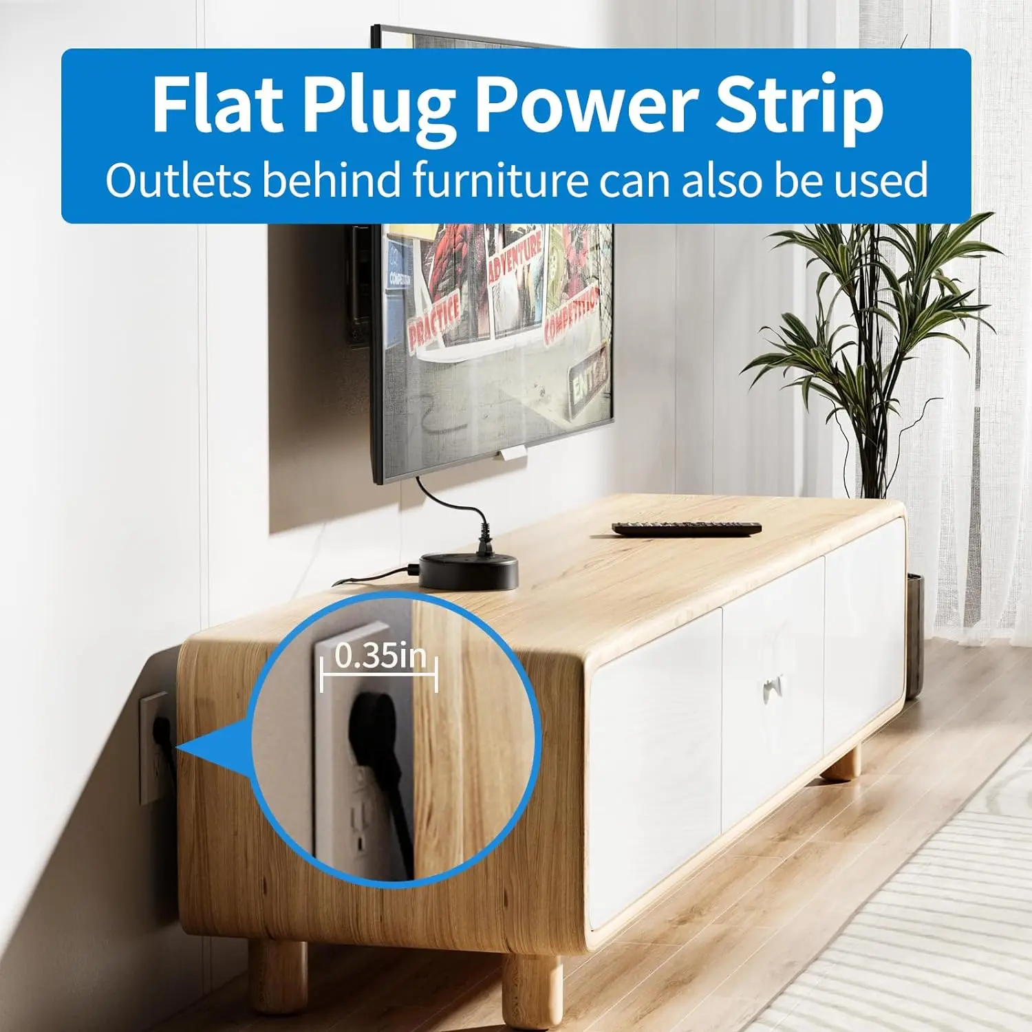 【Flat Cord & 45°Right Angle Flat Plug】 NTONPOWER power strip with USB ports adopts a 45°angle ultra-thin plug, so you no longer have to worry about blocking other wall sockets. The market-leading 0.35-inch ultra-thin plug can also save more space and can be used even behind sofas and cabinets. The 0.11-inch flat cord of the power strip with USB ports can be used in more places, and it is also compatible with the carpet or under the door.