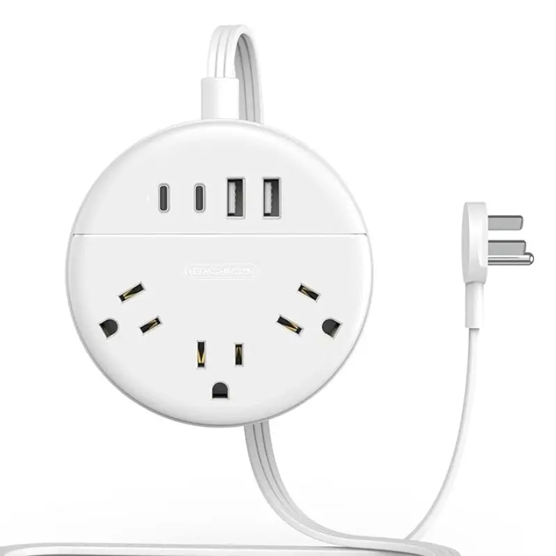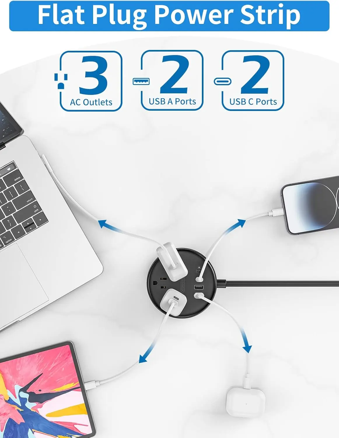 【7 IN 1 Desktop Power Strip】 The 5Ft/10Ft/15Ft/25Ft power strip has 3 AC ports, 2 USB C ports, and 2 USB A ports, a variety of plug types that can meet all your charging needs. The 3 AC ports have a wide spacing of 1.81 inches, so there is no need to worry about the plugs blocking each other. 4 USB charging ports can meet the needs of charging multiple electronic devices at the same time.