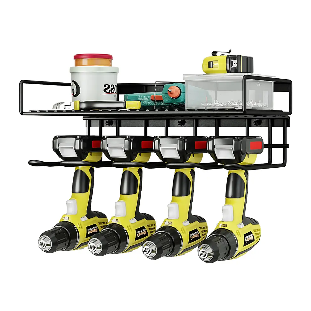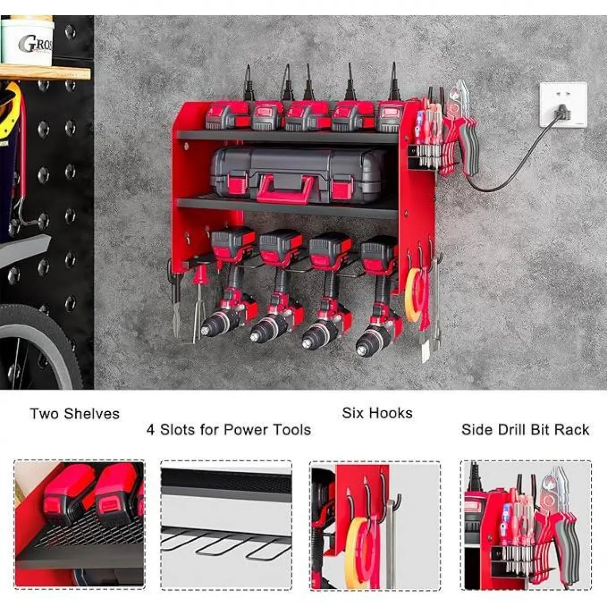 ·Wall mount power tools organizer come with 4 slots, 6 hooks and drill bit rack, built-in power strip, double layer structure can keep rechargeable tools organized in the work area and save your bench space. The tools in the picture are for demonstration purposes only and are not included.
