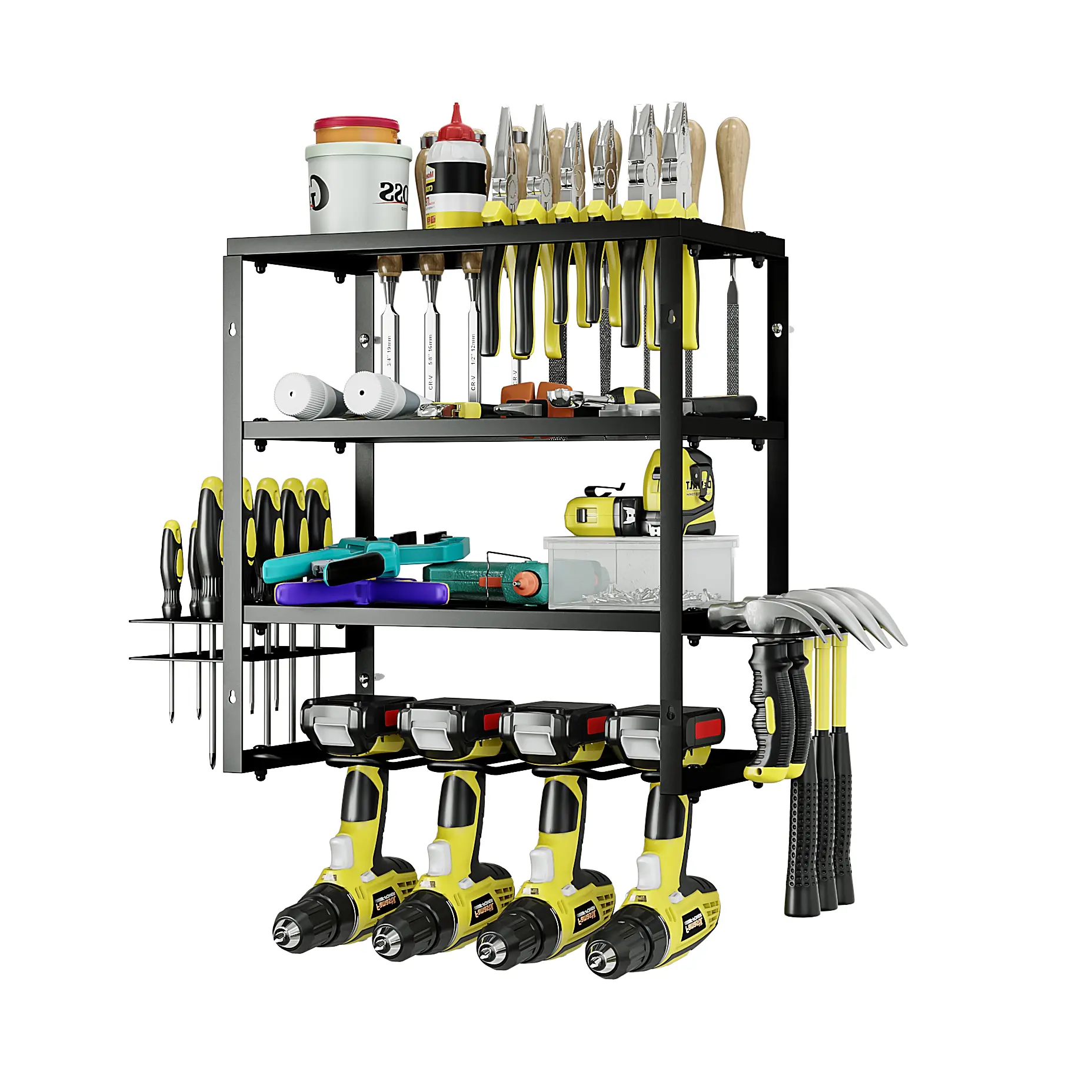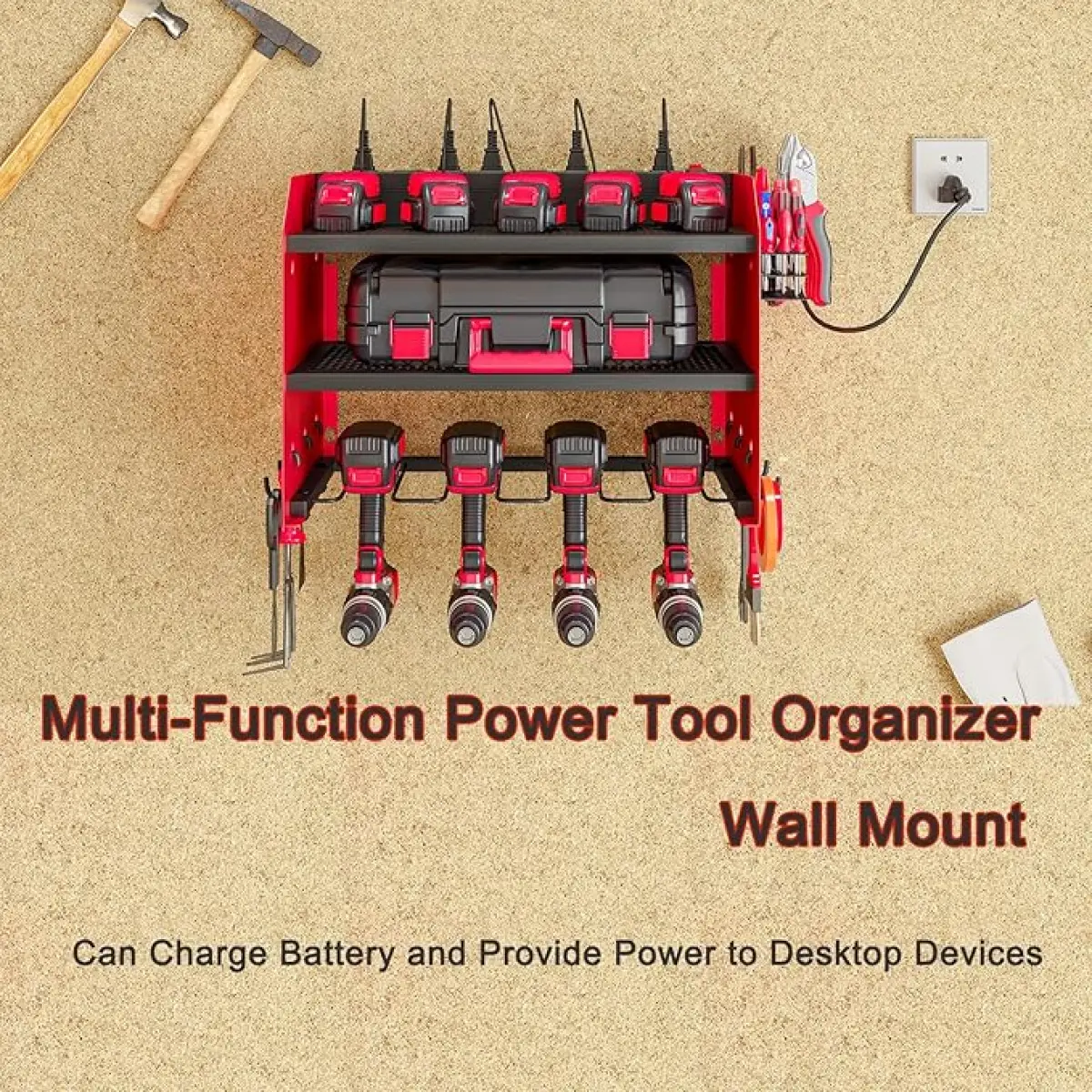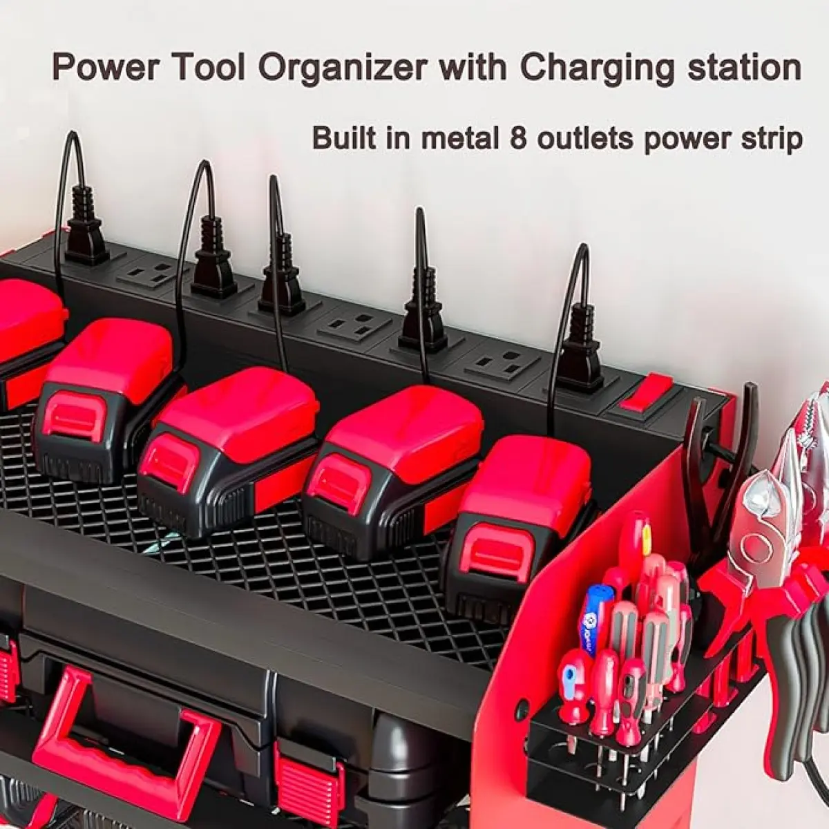 ·Power tool organizer with charging station, come with 8 outlets. If you have a lot of rechargeable tools, you can charge everything right in the rack and avoid searching for sockets.Power cord included.