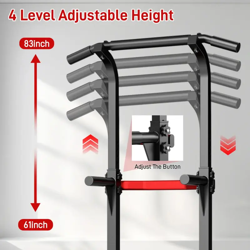 Adjustable Height: This fitness tower is equipped with two safety lock buttons, offering four adjustable height settings.It can easily accommodate different heights, making it suitable for every family member to use