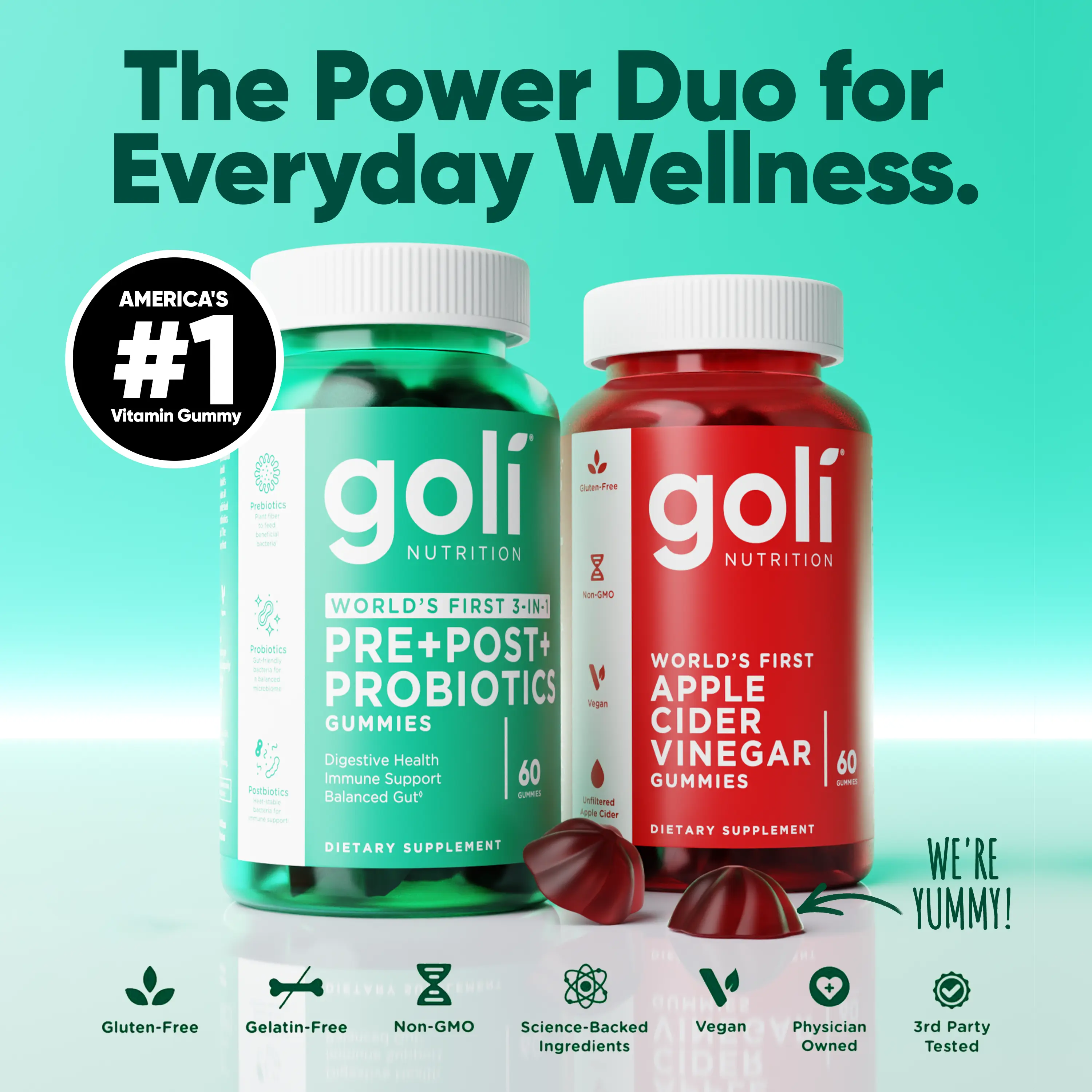 Introducing our Power Wellness Duo Bundle for Gut, Digestion & Immune Includes 1 bottle of World's First 3-in-1 Pre, Post, Probiotic Gummies & 1 bottle of Apple Cider Vinegar & Vitamin B12 Gummies. Gluten-Free, Vegan, Non-GMO & Gelatin-Free