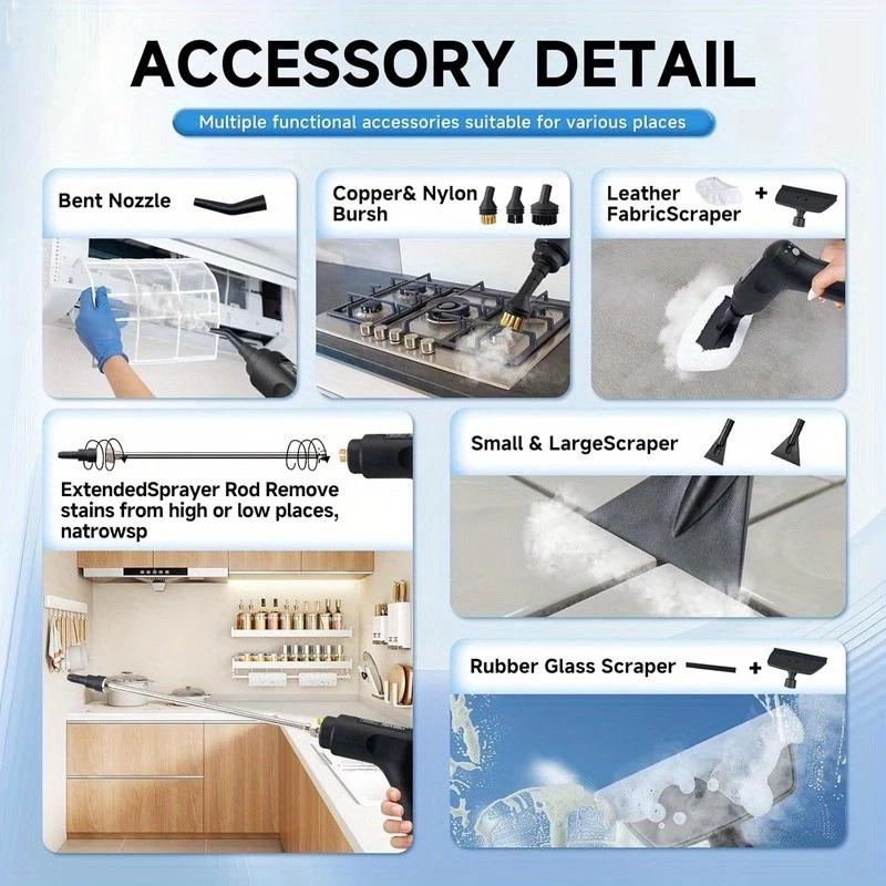 【Widely Used Various scene】Handheld steam cleaner is ideal for homes, offices, and vehicles. It excels as a grout steam cleaner for tile floors, a steam cleaner for bathroom, or even a car steam cleaner. Our clean steamer for cleaning is suitable for cleaning stoves, windows, sofas, walls, microwaves, washing machines, refrigerators, kitchens, living rooms, barbecues, toilets, floors, cars, sofas and clothing.