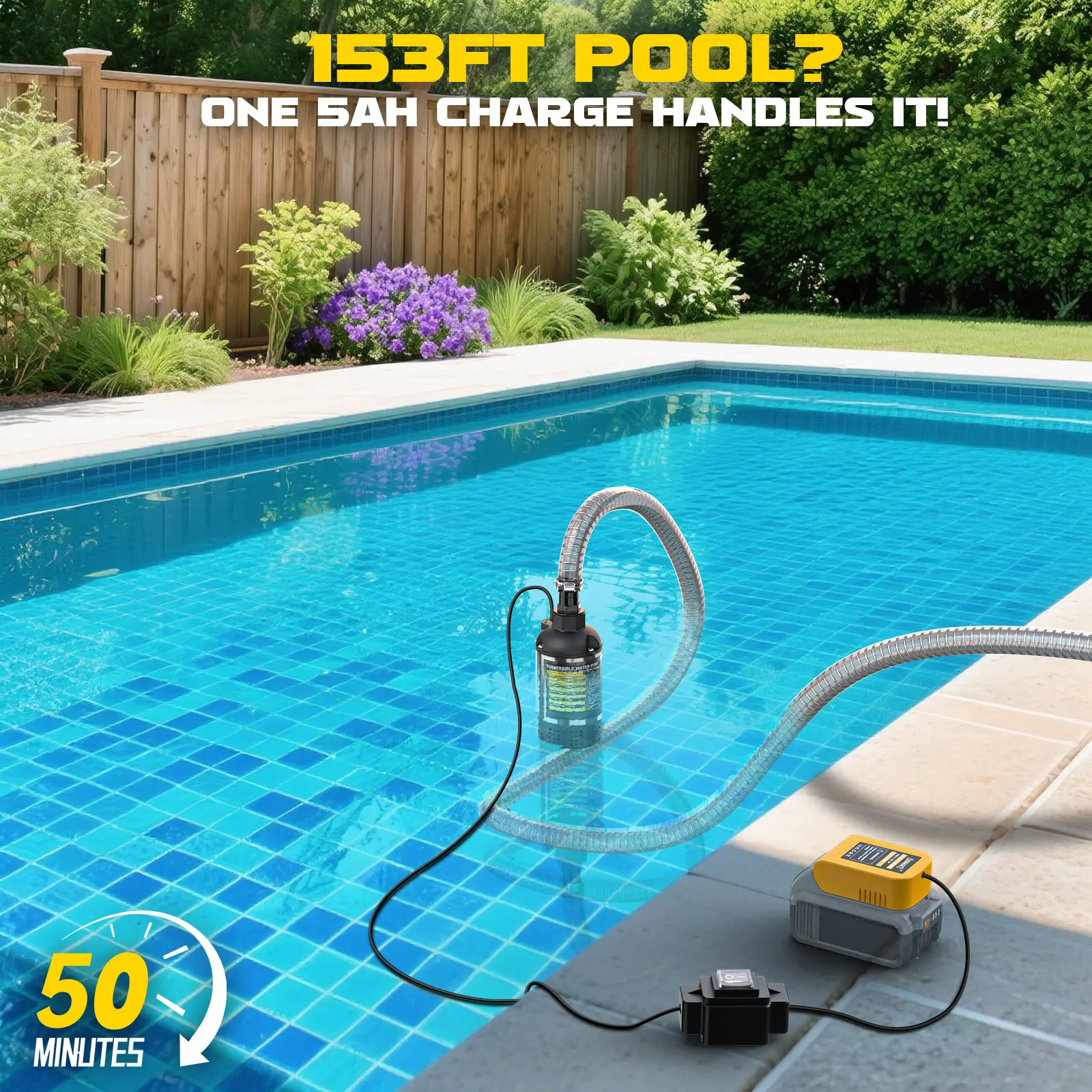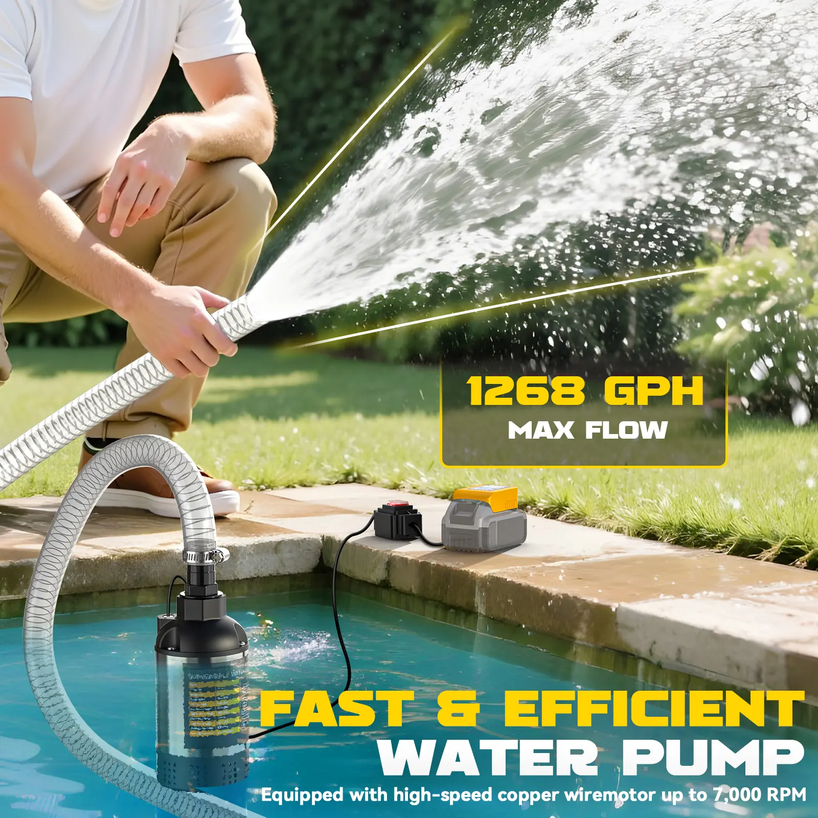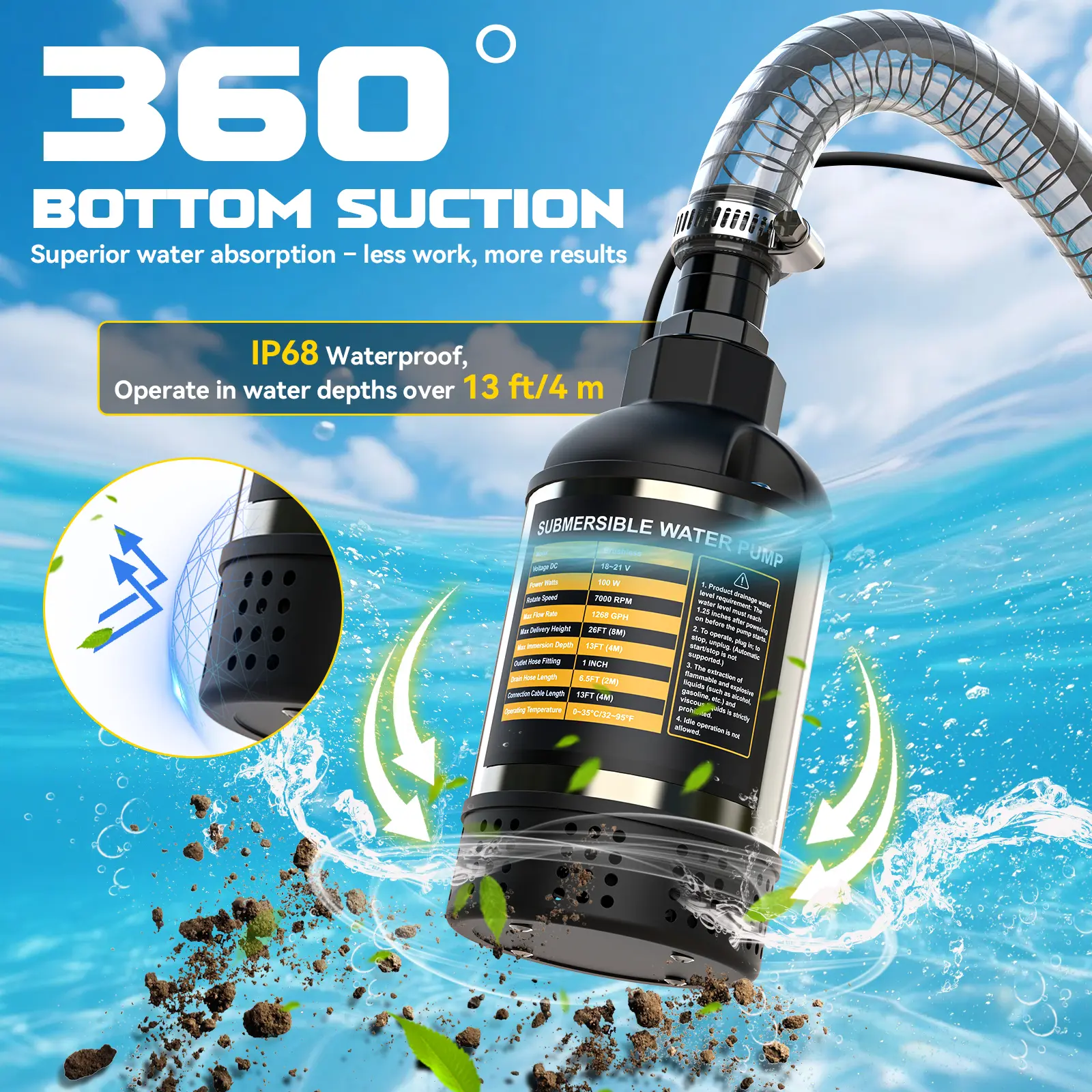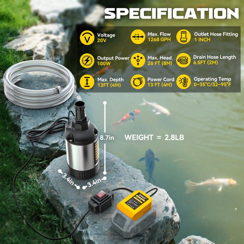 ·Powerful & Efficient Drainage: cordless submersible water pump delivers a high flow rate of 1268 GPH with a 100W efficient motor. Operates effectively at depths up to 13FT and lifts water vertically up to 26FT. Ideal for draining swimming pools, hot tubs, flooded basements, garden ponds, and more.