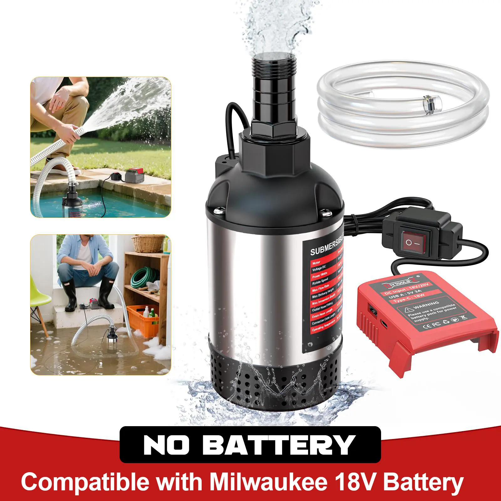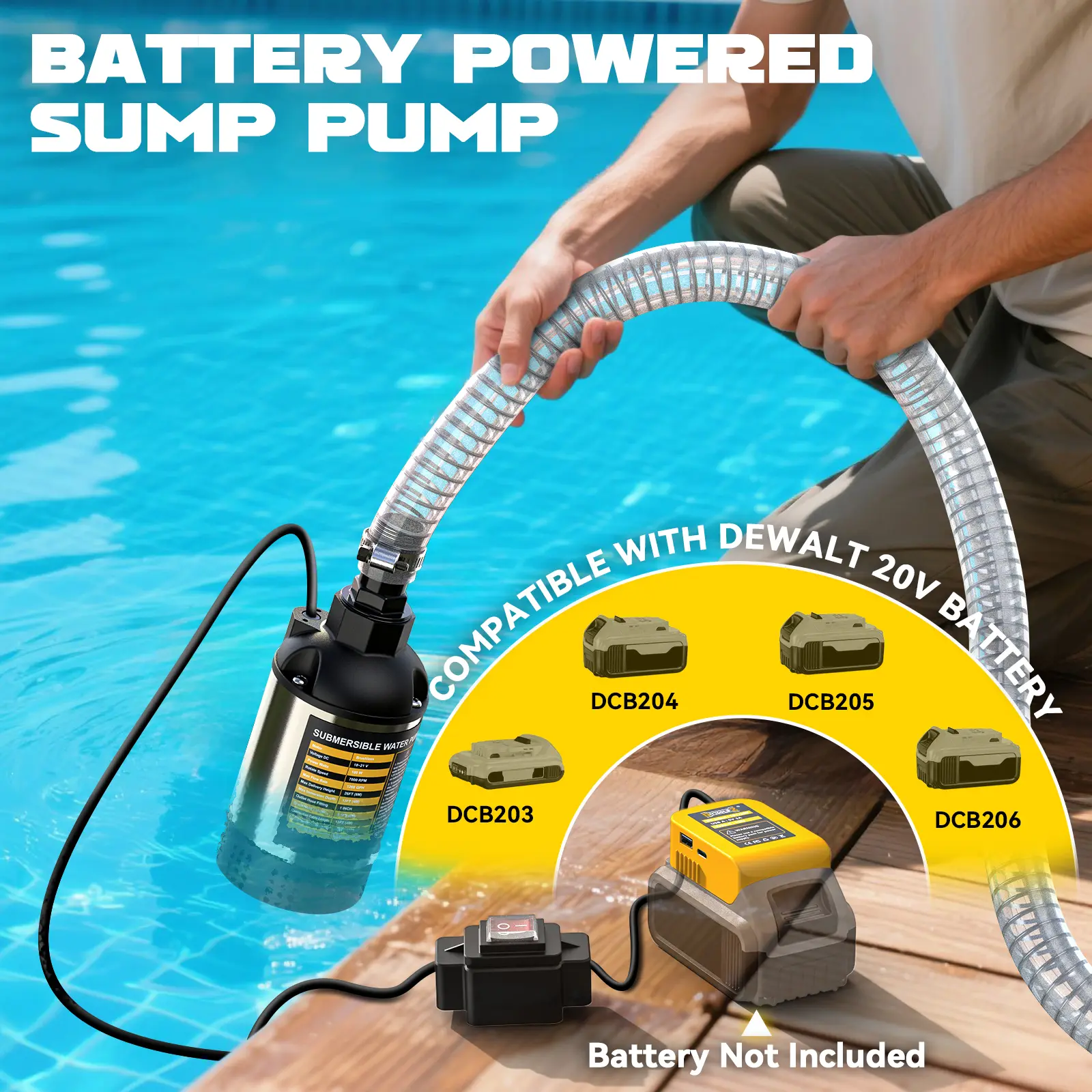 ·Quick Setup: Cordless submersible sump pump compatible with Dewalt 20V equipped with a 13FT power cable, a 1-inch hose adapter, and a 6.5FT garden hose for fast connection and flexible operation. Built from corrosion-resistant stainless steel for long-lasting reliability—ideal for both indoor and outdoor water removal tasks.