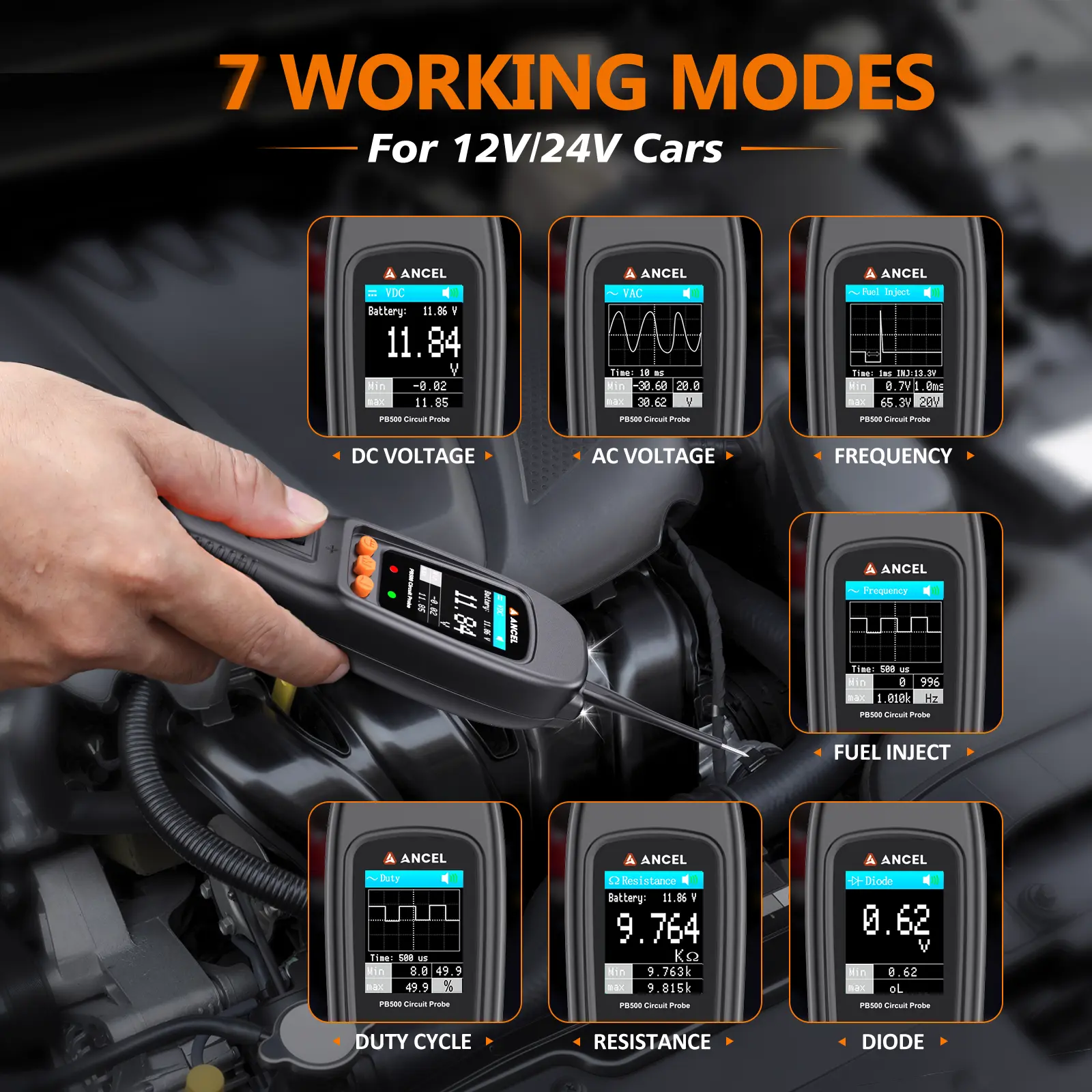 The Ancel PB500 is a versatile automotive circuit tester with a 20ft cable. It features 7 test modes: DC Voltage, AC Voltage, Frequency, Duty Cycle, Fuel Injection, Resistance, and Diode. This tool is ideal for diagnosing electrical systems in 12-24V vehicles. It includes a built-in flashlight and easy-to-read AVOmeter for voltage, current, and resistance. The device is protected by a circuit breaker and comes with an extendable cable for better accessibility.