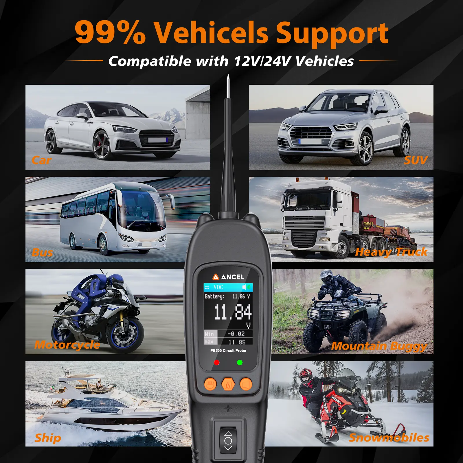 Ancel PB500 is for 12-24V vehicle batteries only. It should not be used on 110/220V household appliances. The LED and LCD consume no more than 100 mA, making it safe for computers and airbags. Always follow instructions to avoid damaging vehicle electrical components during component activation.