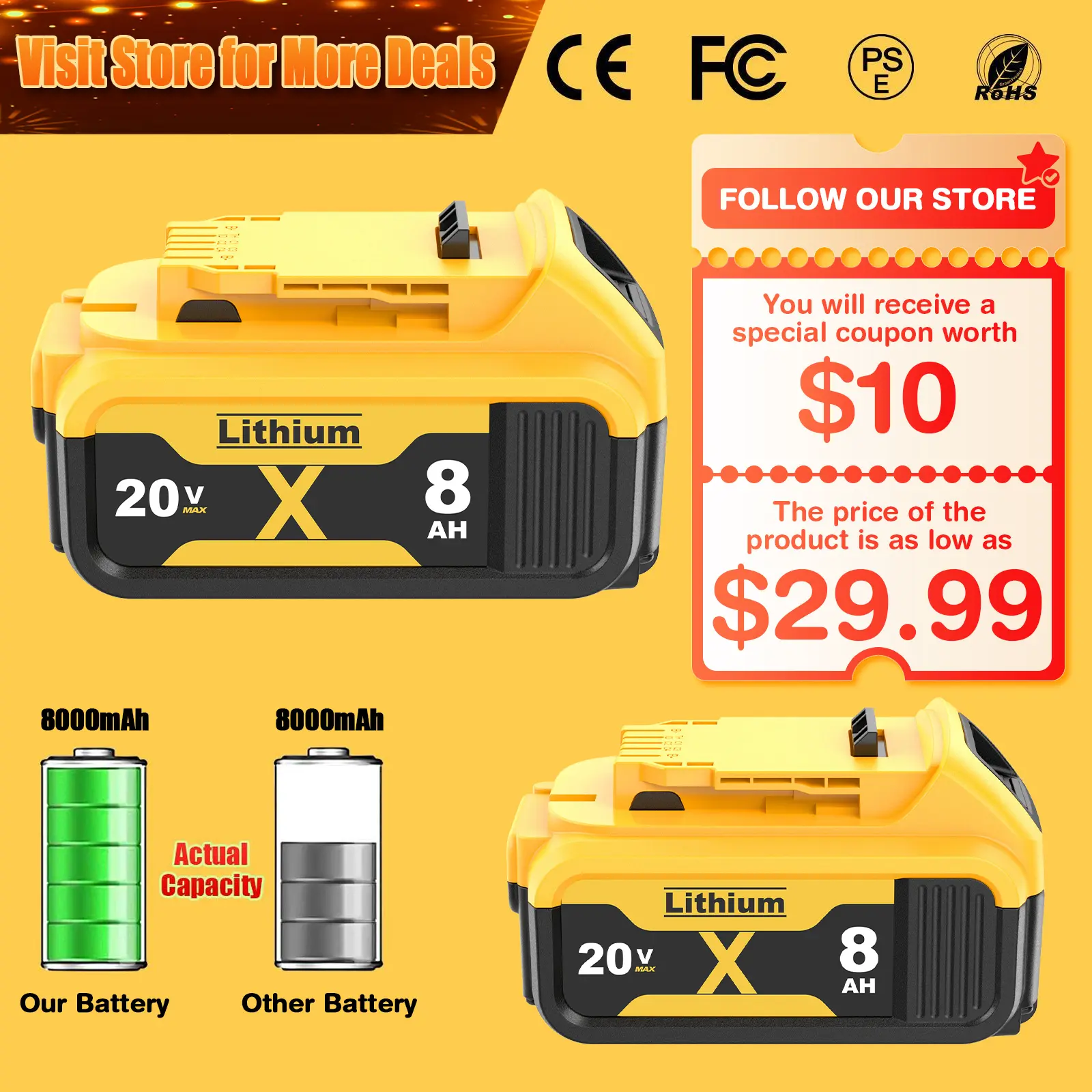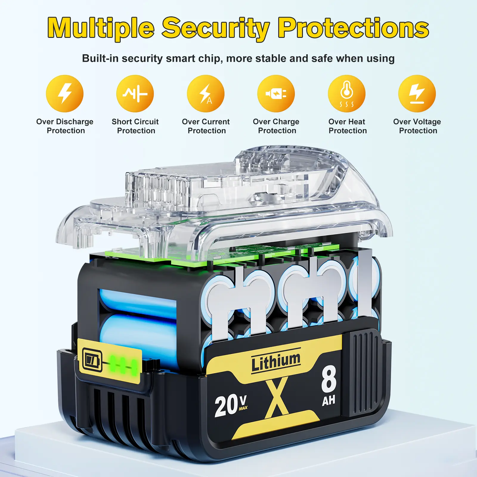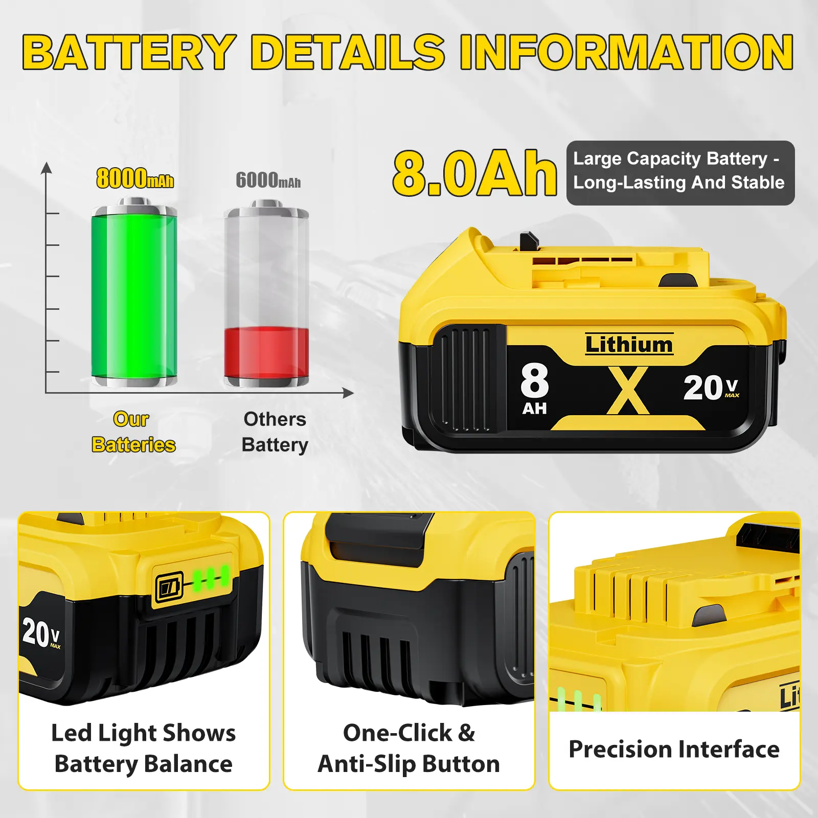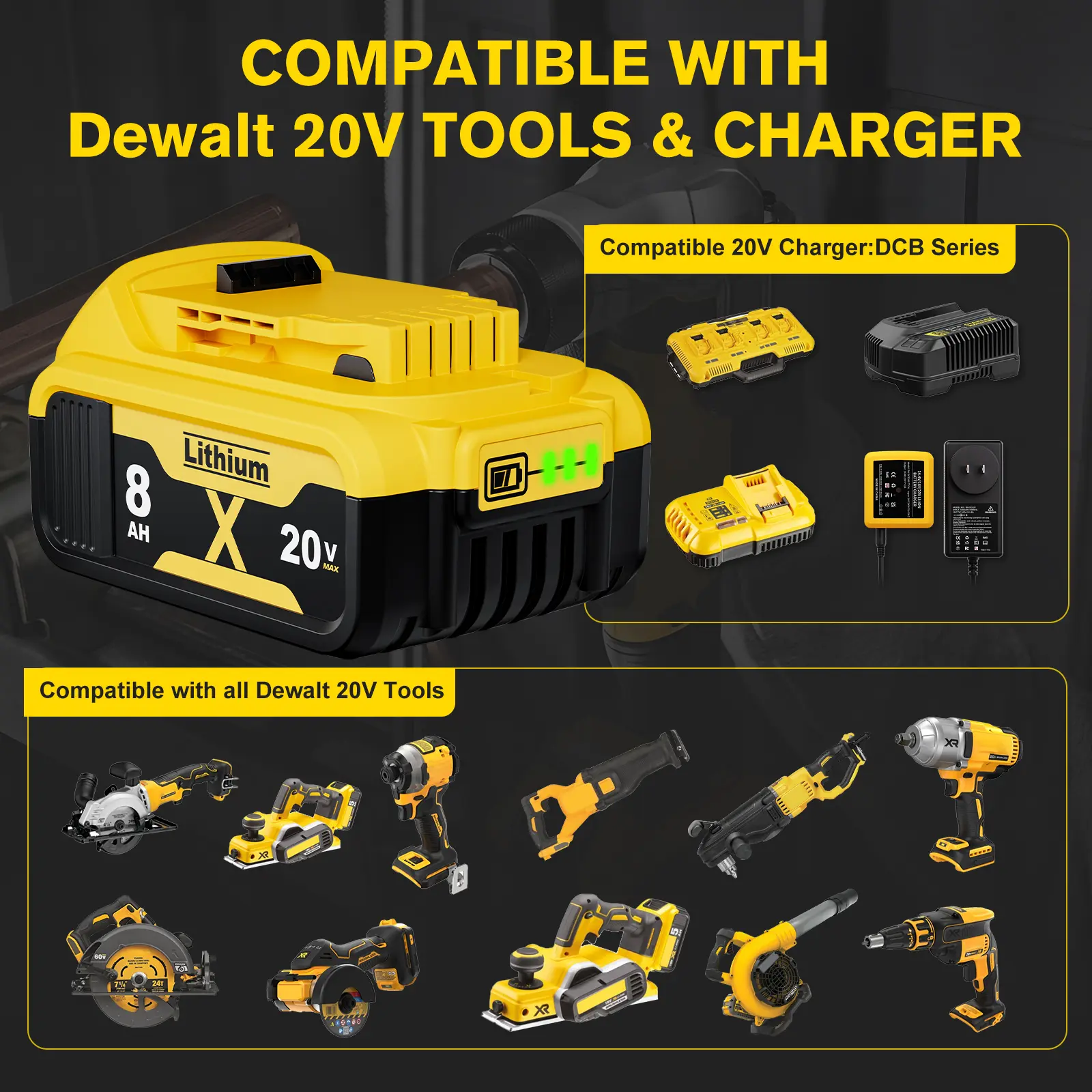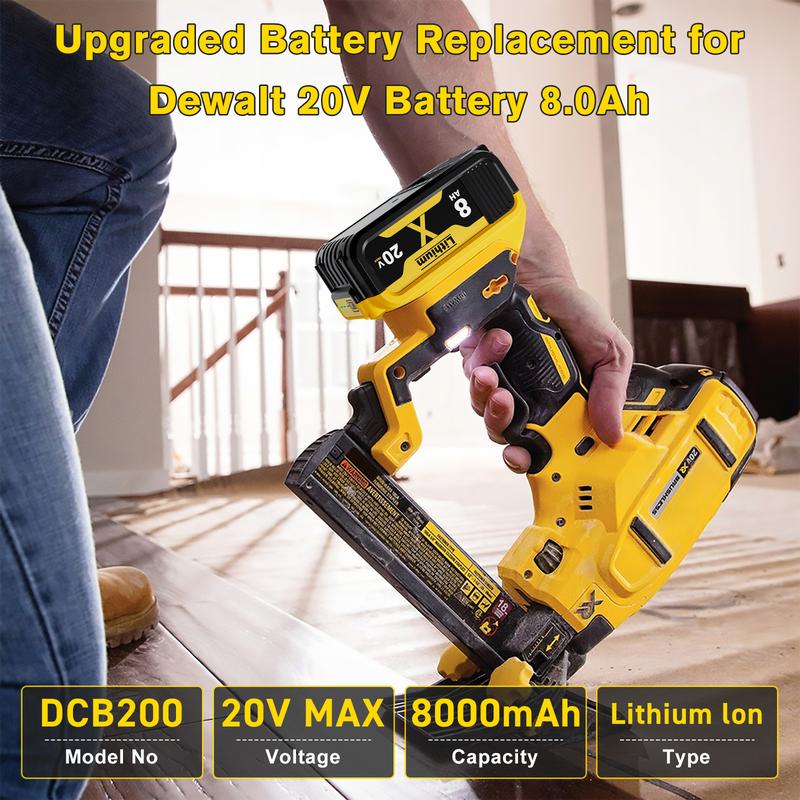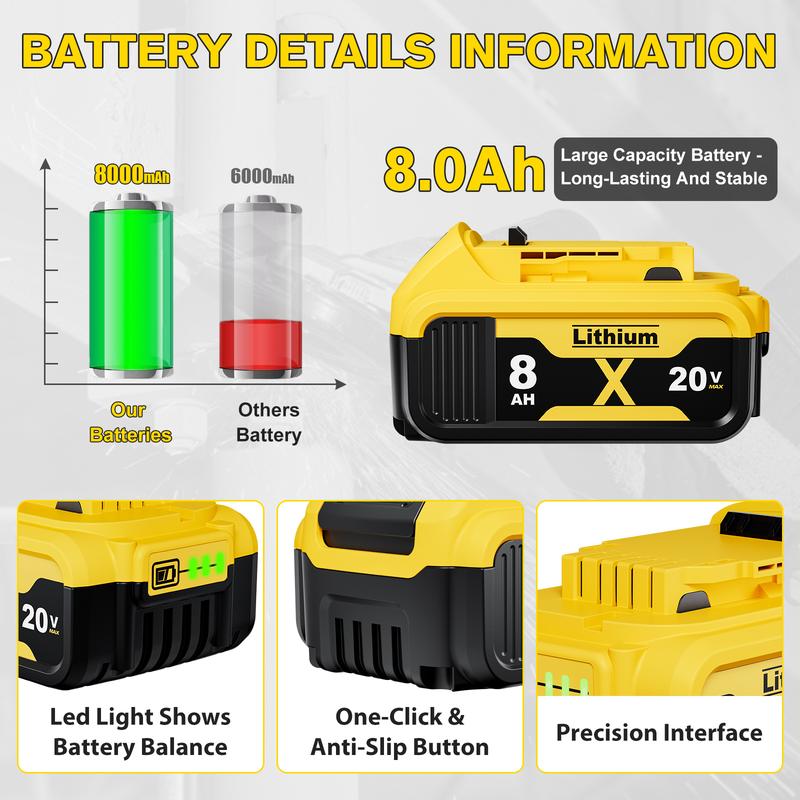 【Battery Specifications】Battery Voltage: 20V | Battery Capacity:8000mAh | Wattage: 160Wh | Battery Type: Rechargeable Lithium-ion | Made with high quality Li-ion cells. Compatible with dewalt cordless tools.