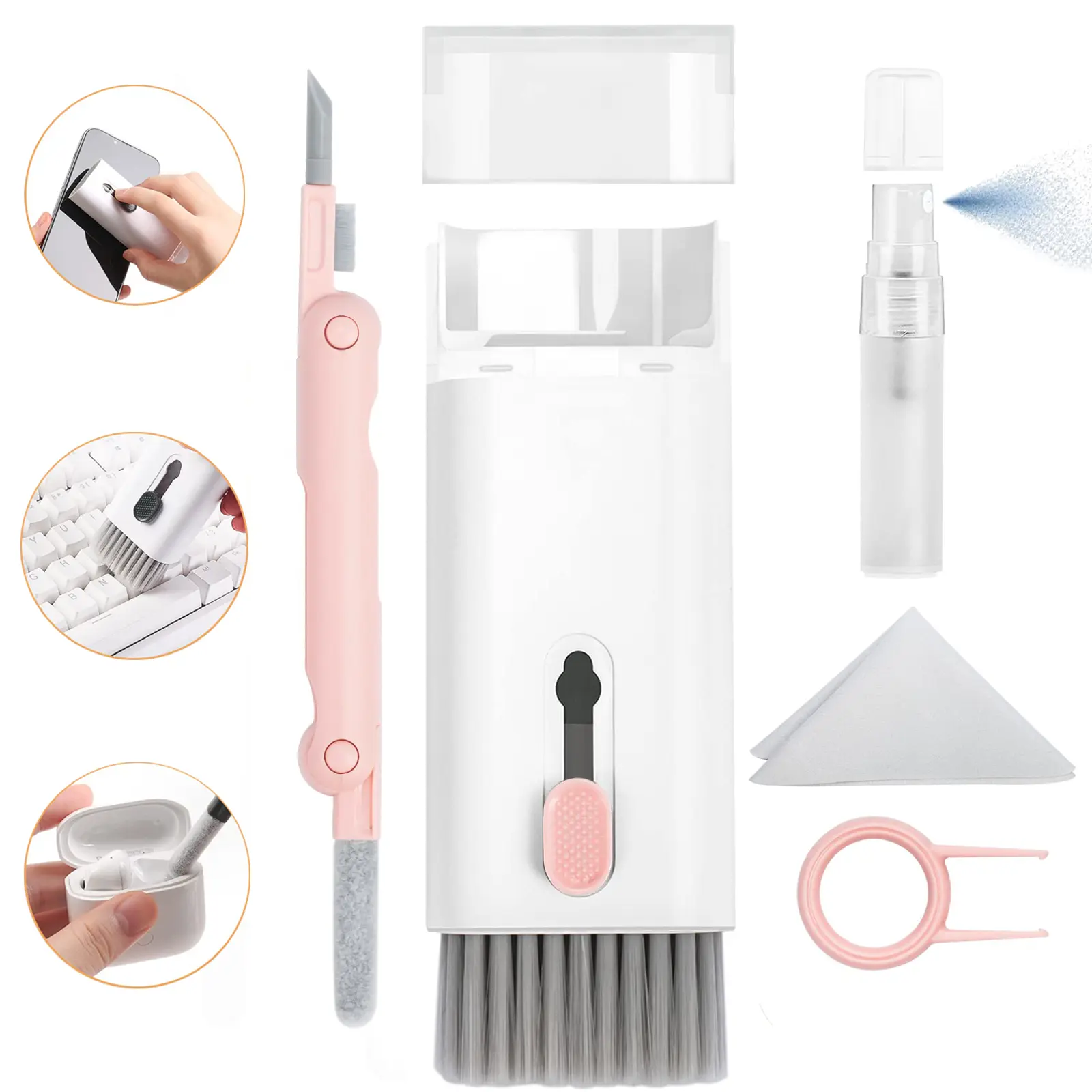 Multi-function Cleaner Kit: All-in-2 laptop and earbuds cleaning tool including cleaner pen for Airpod with silicone nip, plastic nip, flocking sponge and brush, screen cleaner solution spray bottle,