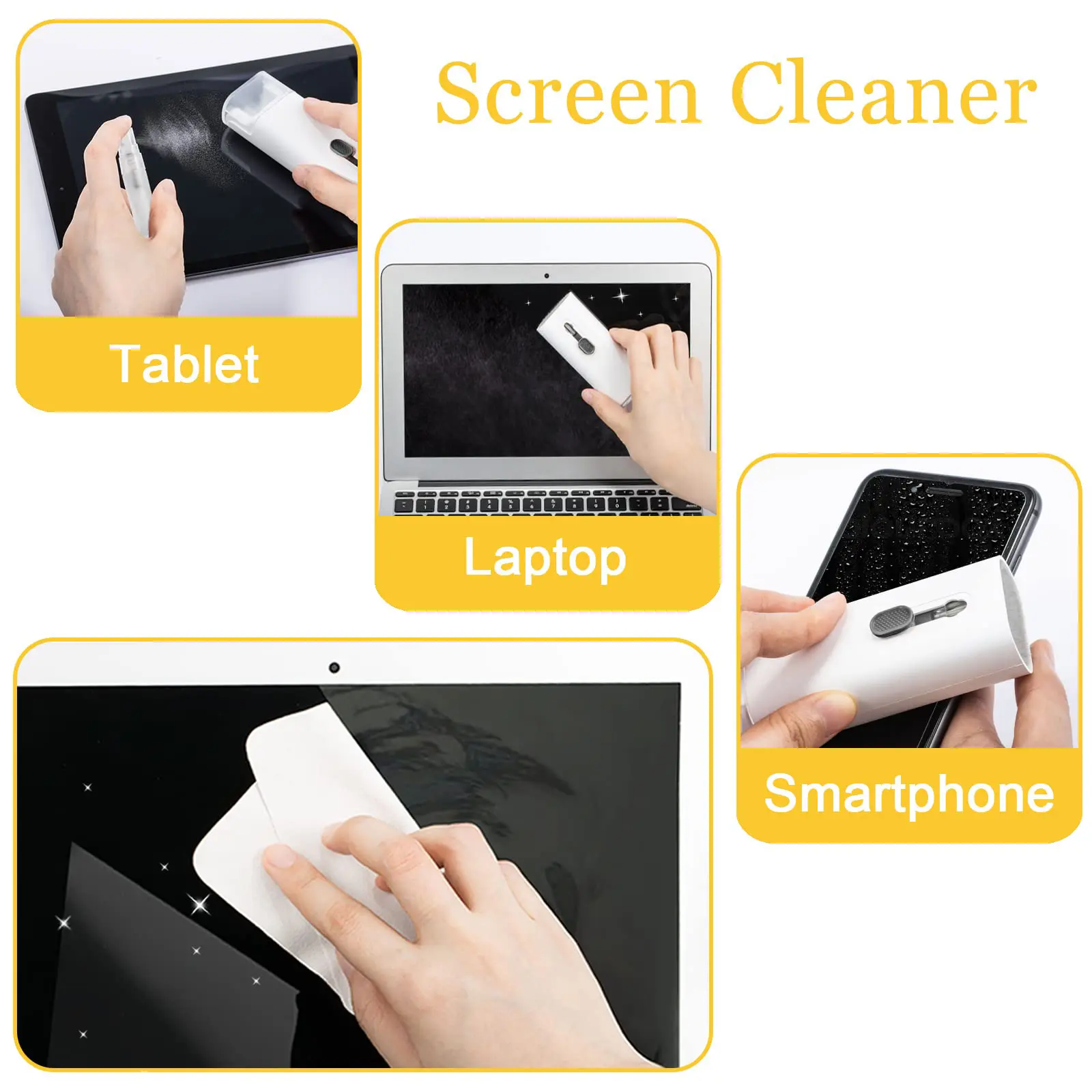 Screen Cleaner Mist and microfiber fiber cloth for Electronics: They are cleaning, antistatic, and degreasing. Easy to remove the oil and fingerprint for the screen of cell phone, tablet PC, laptop, indicator, TV;
