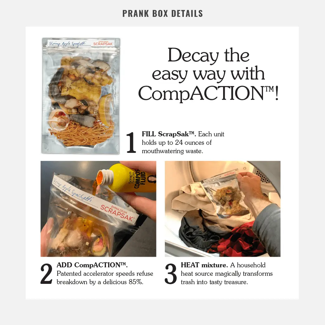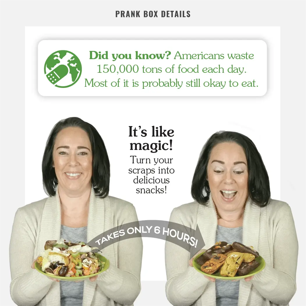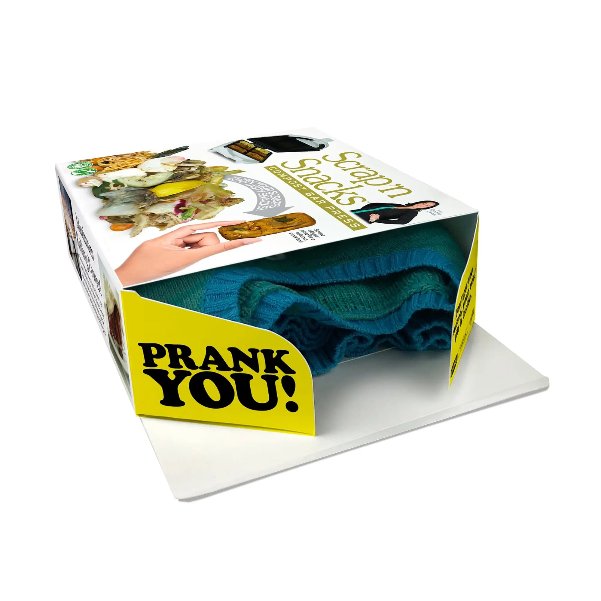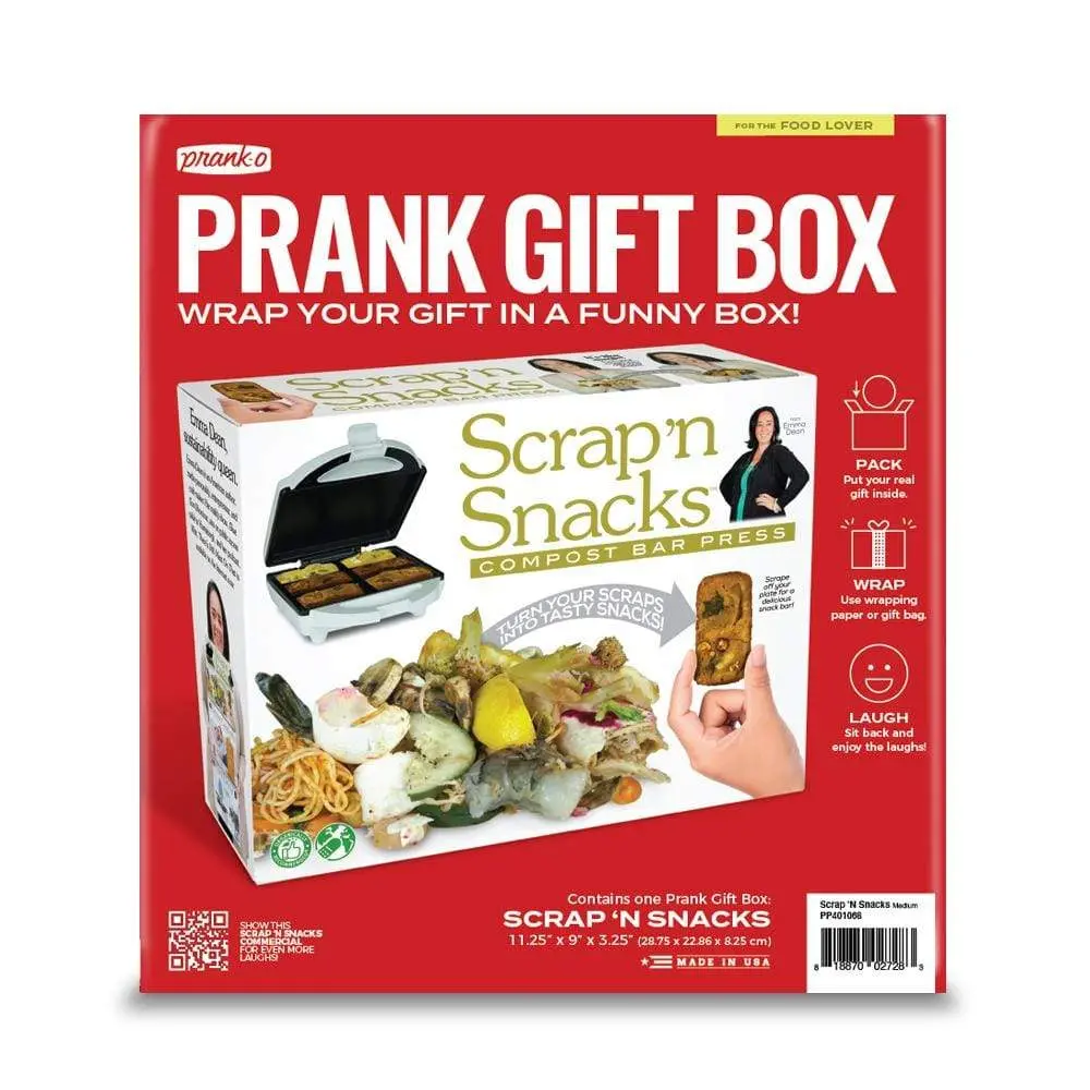 Don't throw away those food scraps! Turn them into delicious energy bars with Emma Dean's Scrap 'n Snacks Compost Bar Press. This prank gift box holds many real gifts.