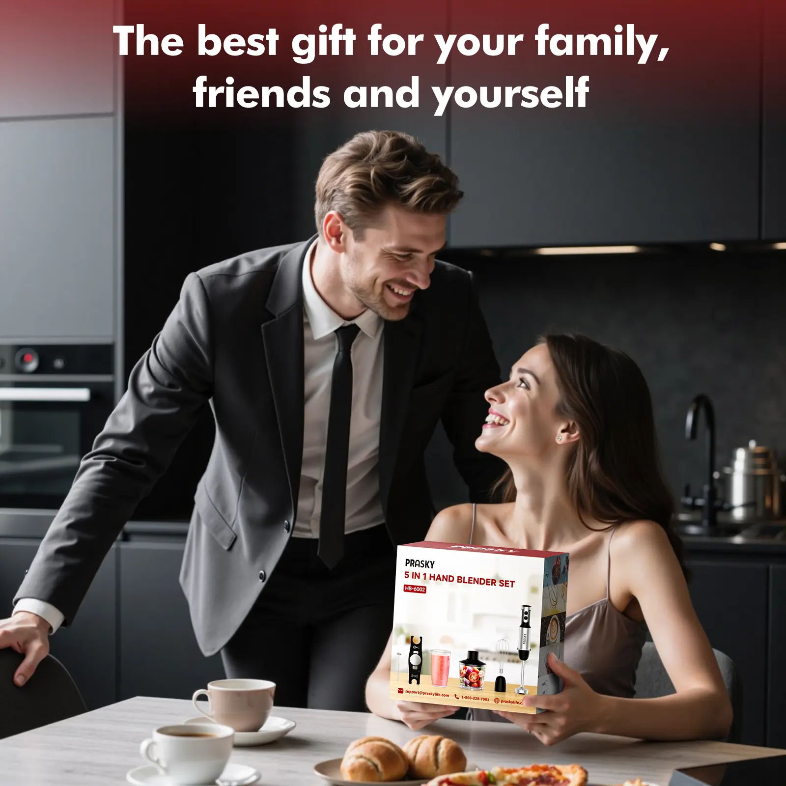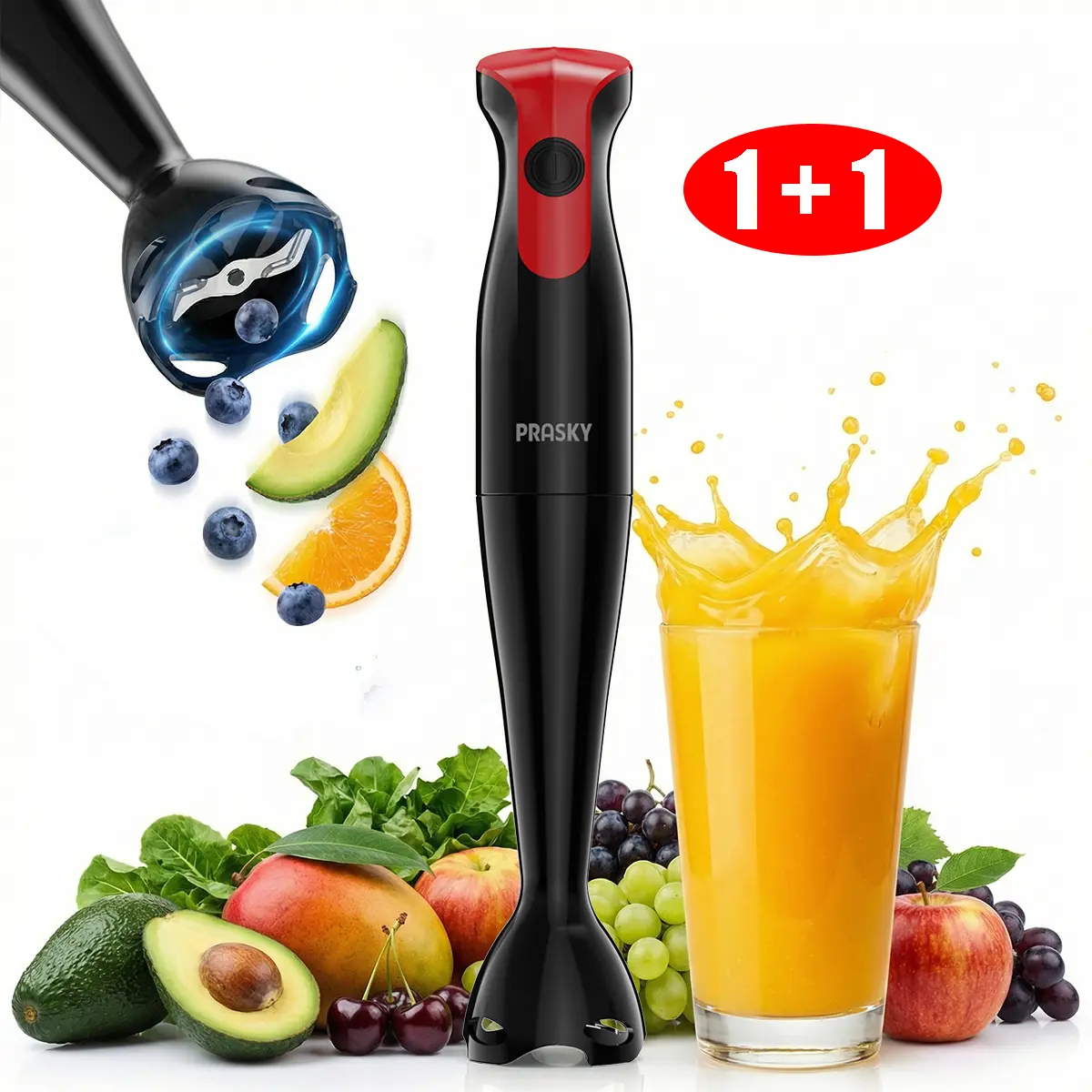 PRASKY immersion blender includes a 24oz beaker, 17oz food chopper bowl, egg whisk, and stick blender. Perfect for protein shakes, soups, sauces, salsa, mayonnaise, smoothies, whipped cream, and baby food—making cooking easier than ever.