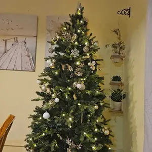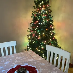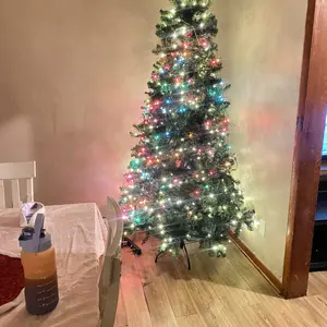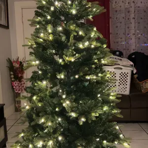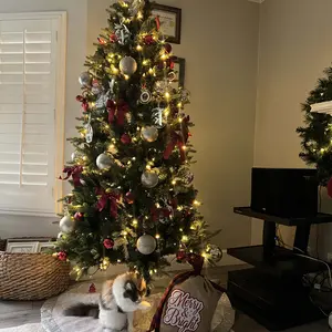 I was skeptical about buying a faux tree on TikTok Shop, but I am SO HAPPY I did. It is beautiful, easy to set up, and looks amazing. I got the 7.5 foot green tree. Fluff every branch and work section by section for the best shape (took me by myself around 1 hour). The remote has multiple light modes and adjustable speed and brightness. It only white warm white lighting, no colored lights. The stand is sturdy metal. The tree topper was a little heavy for the top branch, but I made it more sturdy by folding the branch down in half. It is a MUST BUY you won’t regret it!