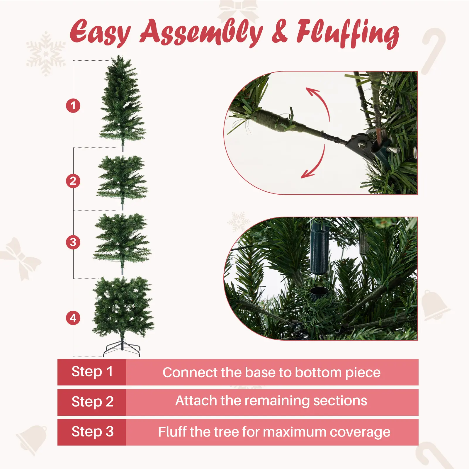 ·[Quick & Hassle-Free Assembly] Featuring a intuitive 3-section hinged design (A, B, C), Xmas tree sets up in minutes—branches unfold naturally into place. Just gently adjust the tips to eliminate gaps and achieve a beautifully full tree in no time. Spend less time assembling and more time celebrating!