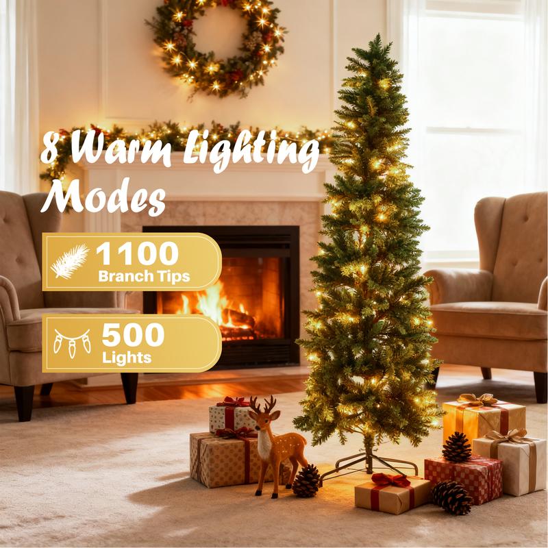 ·[8 Modes of Warm Pre-Lit Lights] Slim Christmas trees comes pre-wrapped with 250 energy-efficient warm white LED lights, offering 8 customizable lighting effects—including Combination, Waves, Sequential, Twinkle, Slow Fade, and Steady-On. Set the perfect holiday mood with just a click of a button!