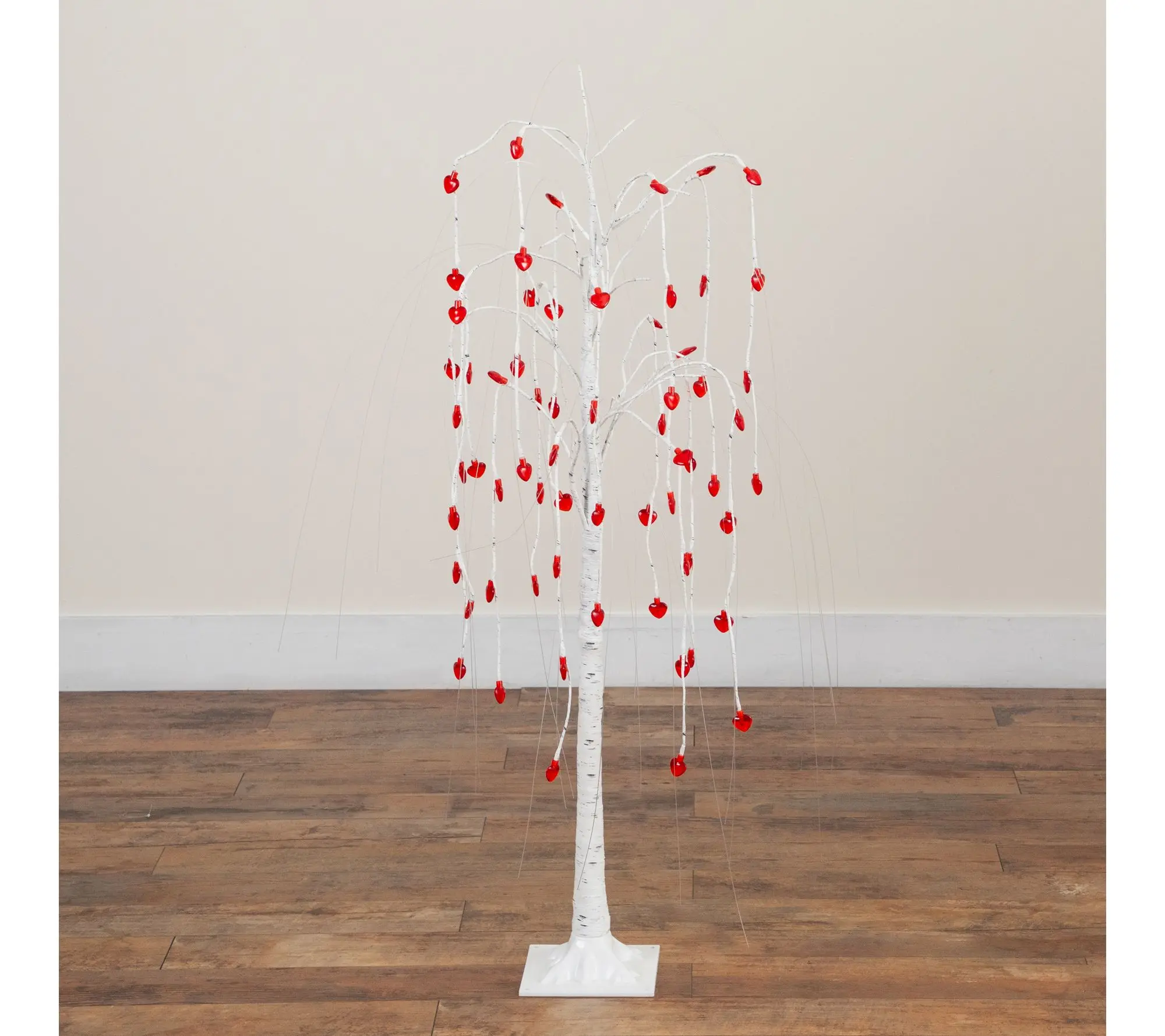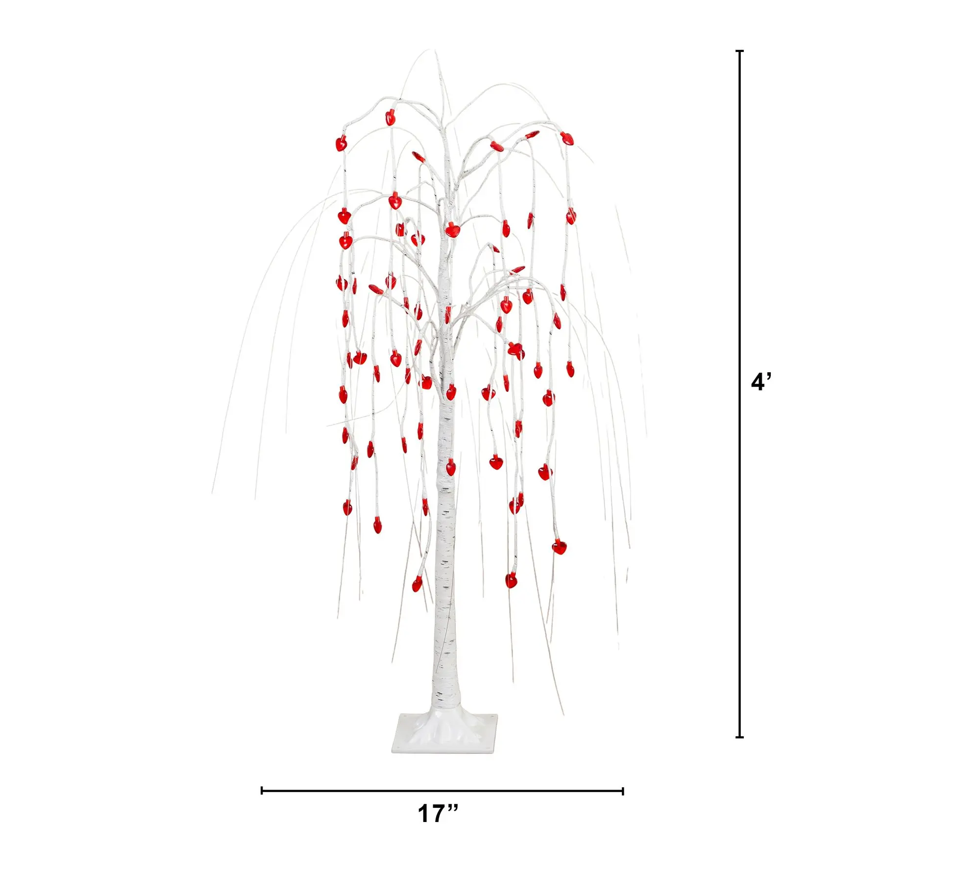 Add a touch of romance and modern elegance to your space with this 4-Ft Pre-Lit Artificial Willow Tree. Adorned with soft hued, heart-shaped LED lights, this charming tree features delicate willow-like branches that gracefully drape, creating a gentle, glowing ambiance perfect for Valentine's Day or any cozy occasion. The sturdy, white birch-style trunk makes a striking statement and seamlessly complements any decor style -- from intimate tabletops to inviting entryways.